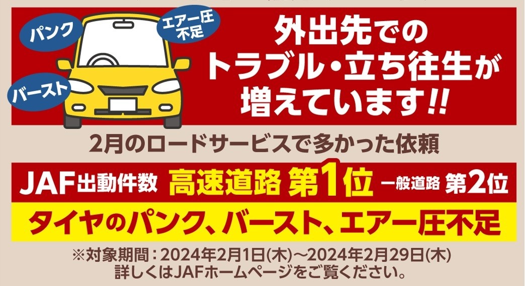 実は昨年の2月のJAF出動件数を見るとタイヤに関わる「高速道路」でのトラブルが多かったようです
