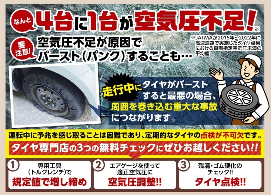 JATMAの調査では【4台に1台が空気圧不足】というデータがあります