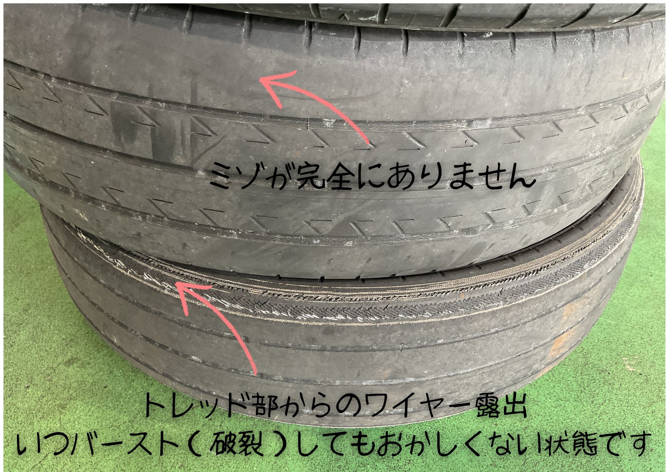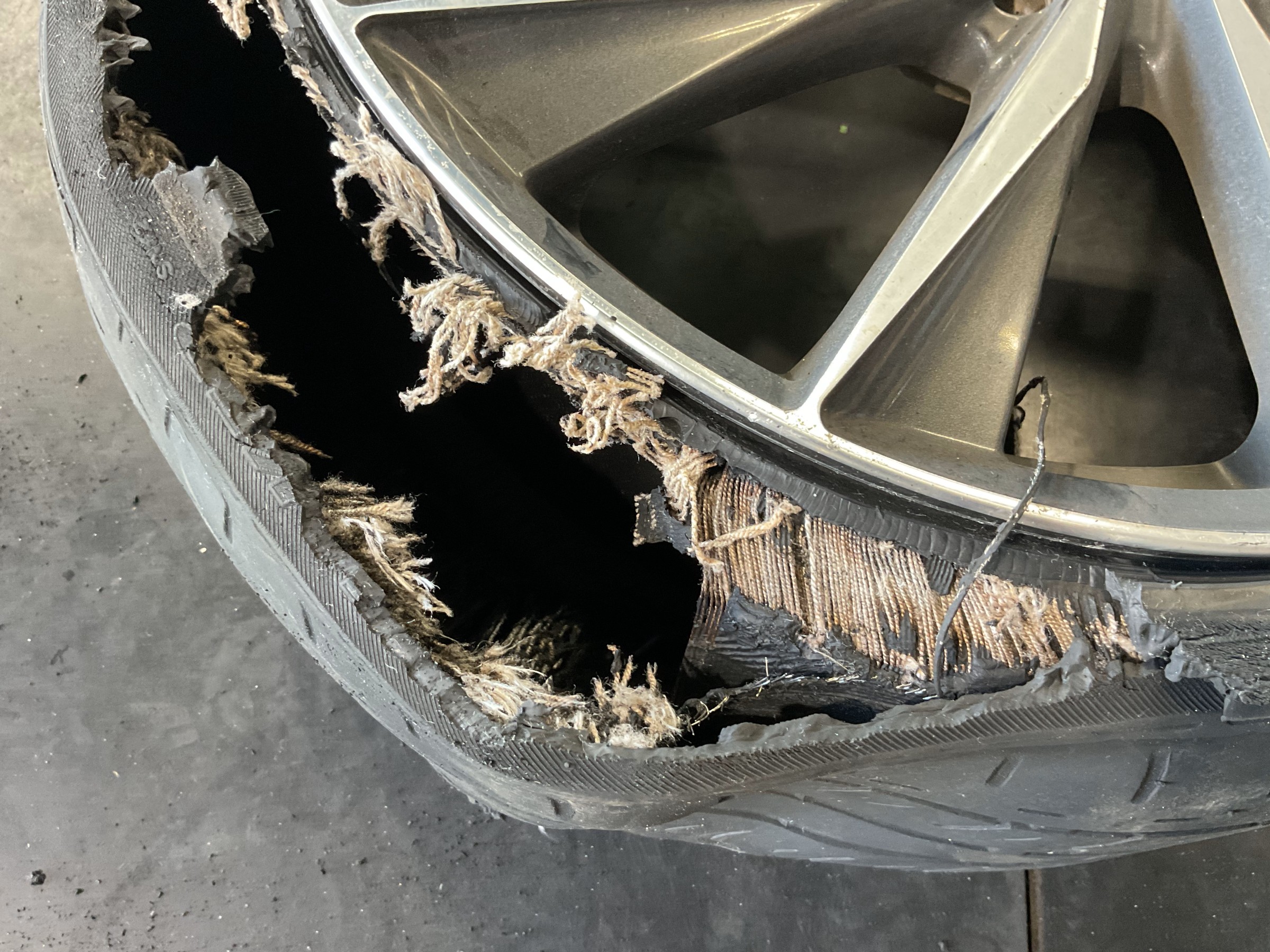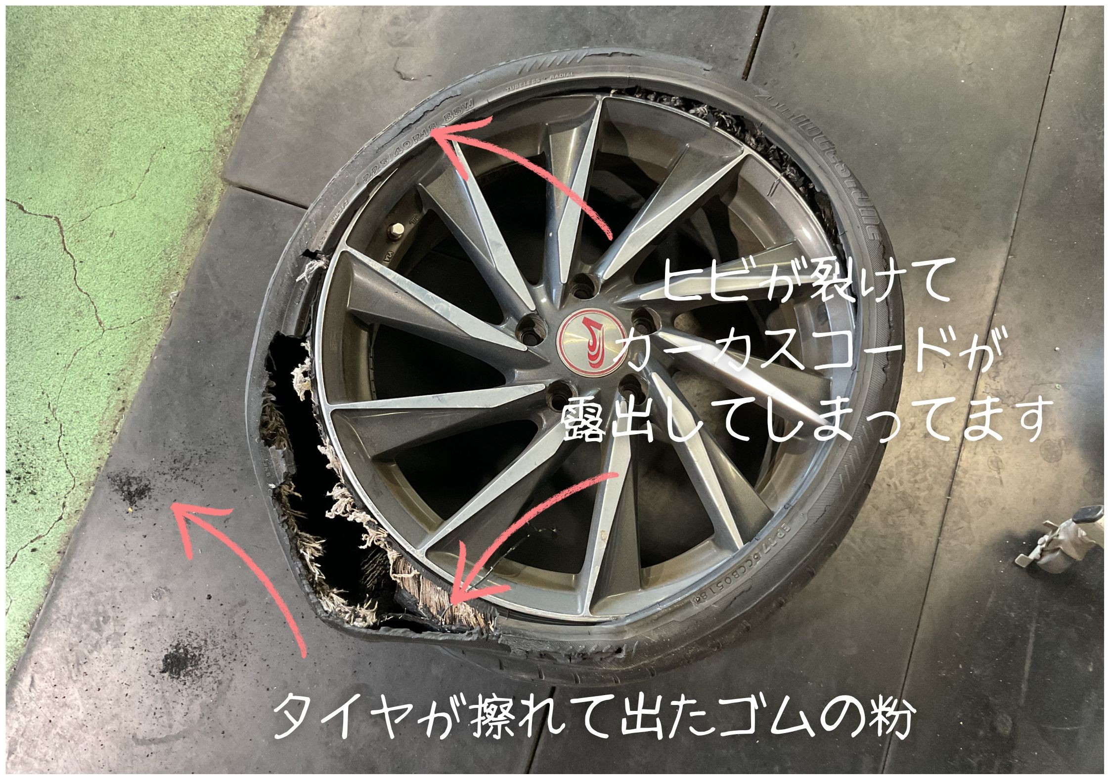ホイルで潰され、タイヤ側面が切れカーカスコードが露出してしまっています。
