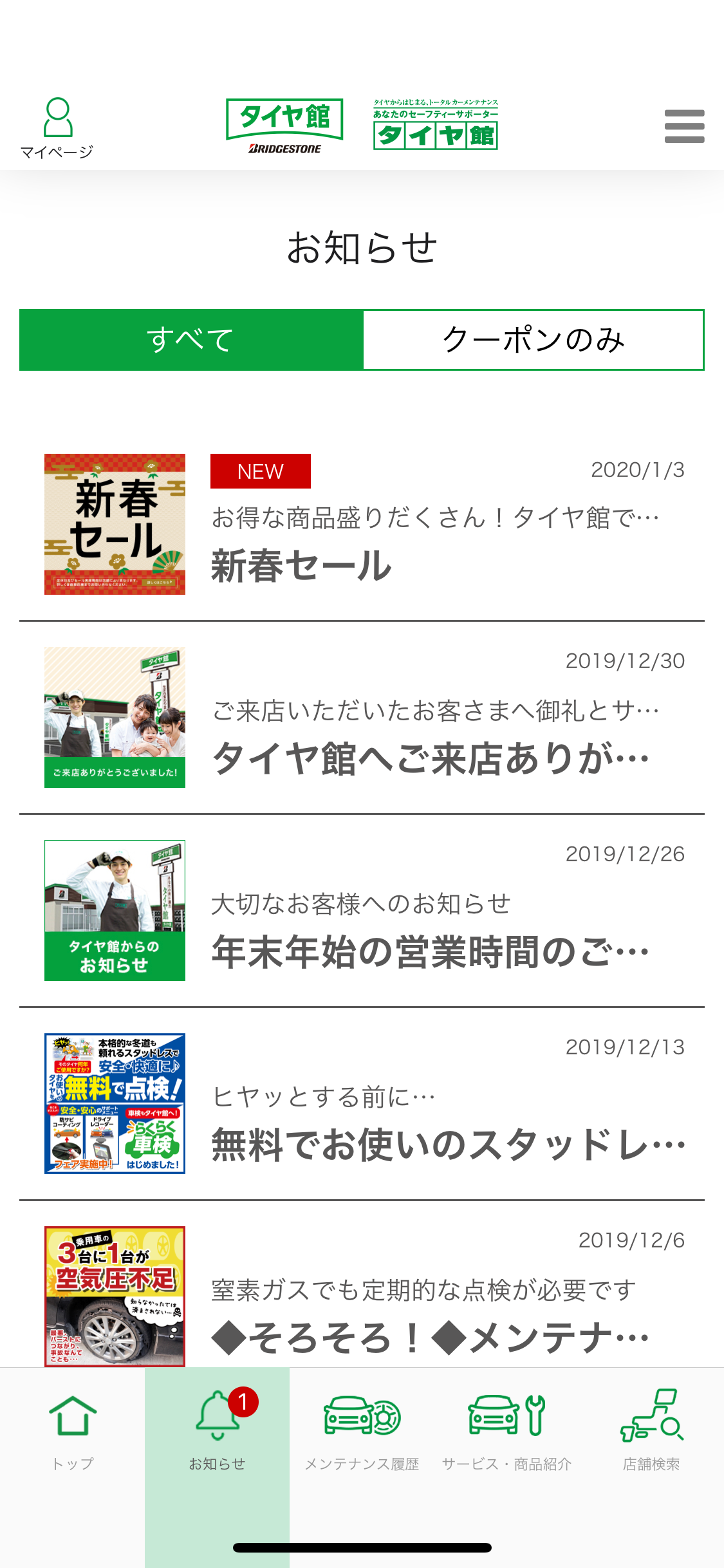 タイヤ館からのお知らせ、ブリヂストンのブログなどの情報をお知らせしたり
