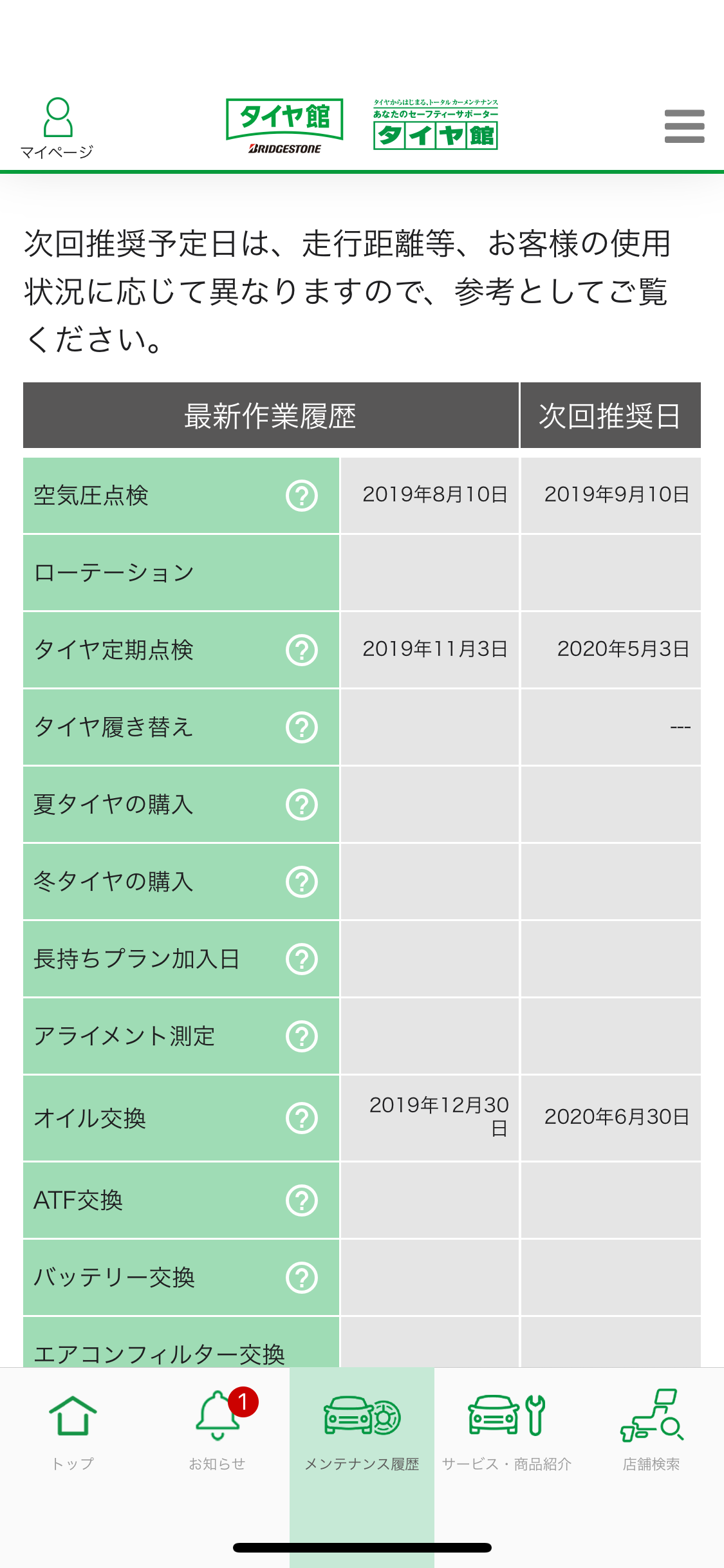 タイヤの空気圧点検やオイル交換他メンテナンス商品の交換やご購入を最後に行った日がわかり、