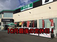 遂に、この日を迎えてしまいました。笑 10月最後の定休日でございます。。。 来週から定休日無しで営業致しますよ~ タイヤ交換予約もドンドン埋まってきております! ご予約は11時から1時間に1台ですので、 お早めにご予約頂かなければご希望の日時に入れませんよ~(/ω\) その場合、通常受付で...