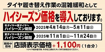 いつもタイヤ館桔梗店をご利用頂きありがとうございます! 2025年より、タイヤ履き替え作業の混雑緩和として 「ハイシーズン価格」を導入させて頂いております。 ************************** 【冬のハイシーズン期間】 ■2025年11月1日(土)~2025年11月24日(月・祝)ま...