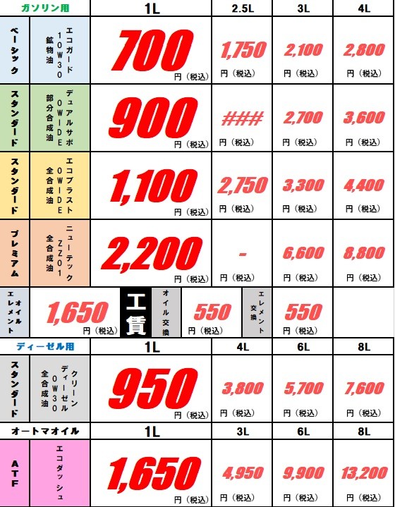 ~車種別参考 L 数~ ※エレメント交換無しの場合