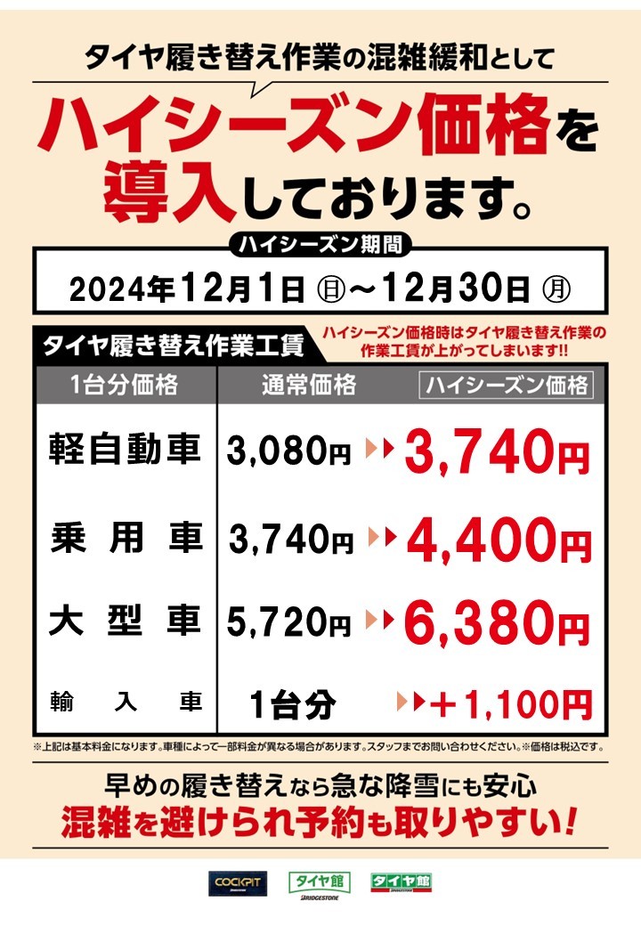 タイや履き替え作業混雑緩和としてハイシーズン価格を導入しております。11月までの履き替えをオススメ致します。