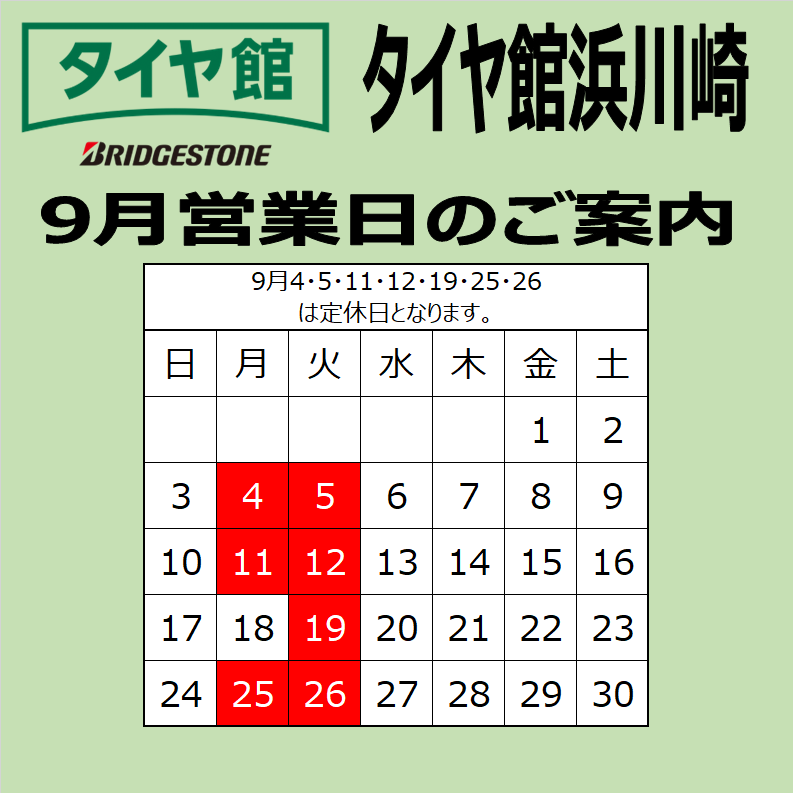9月4・5・11・12・19・25・26は定休日となります。 宜しくお願い致します。