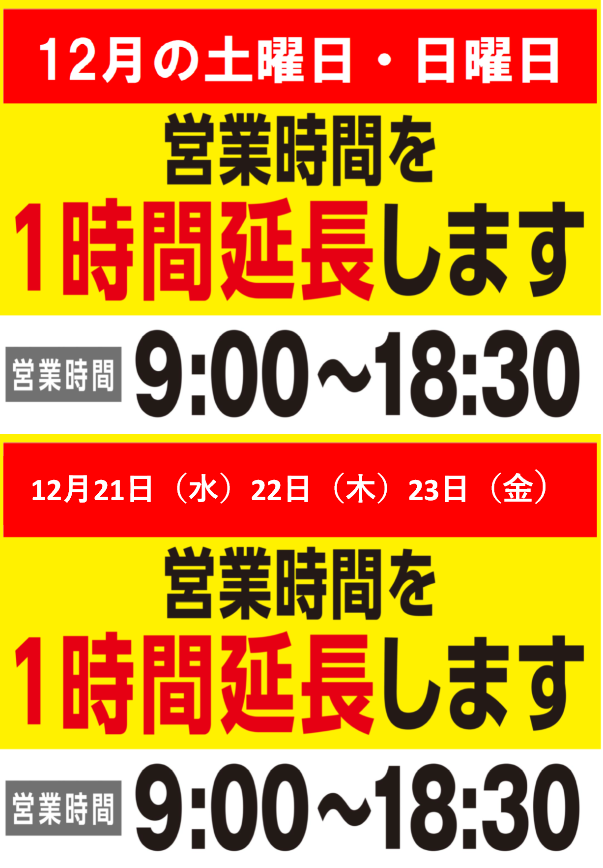 12月の土曜日・日曜日は営業時間が1時間延長となります。 12/21~23も延長いたします。よろしくお願いいたします。