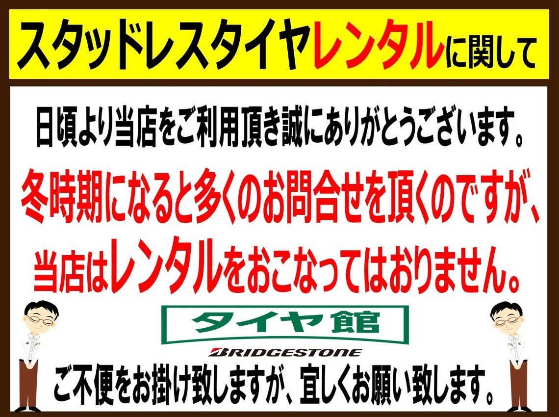 スタッドレスタイヤ(冬タイヤ)のレンタルに関して。 2024年11月1日 こんにちは。 浜松市中央区(旧中区)高林マルツ浜松店さん・ハードオフ浜松高林店さん近くにありますタイヤ館浜松高林です! いつも当店のホームページをご覧頂きましてありがとうございます。 当店は『タイヤレンタル』をおこなっておりません。 誠に申し訳ございません。 ご理解の程宜しくお願い致します。m(__)m