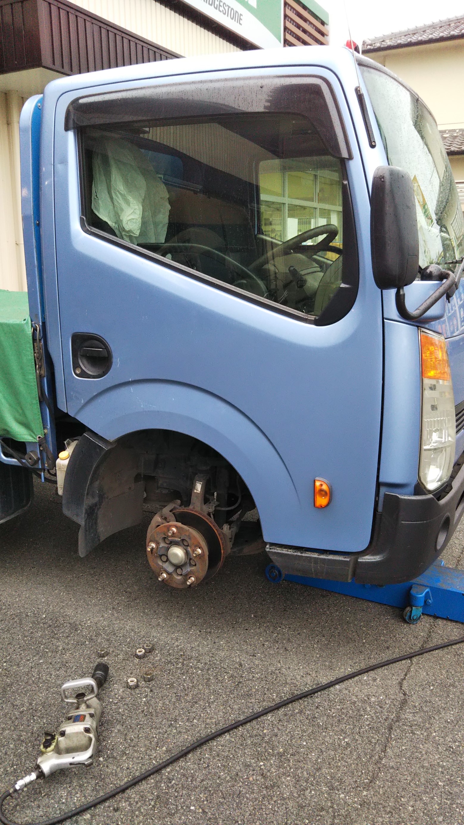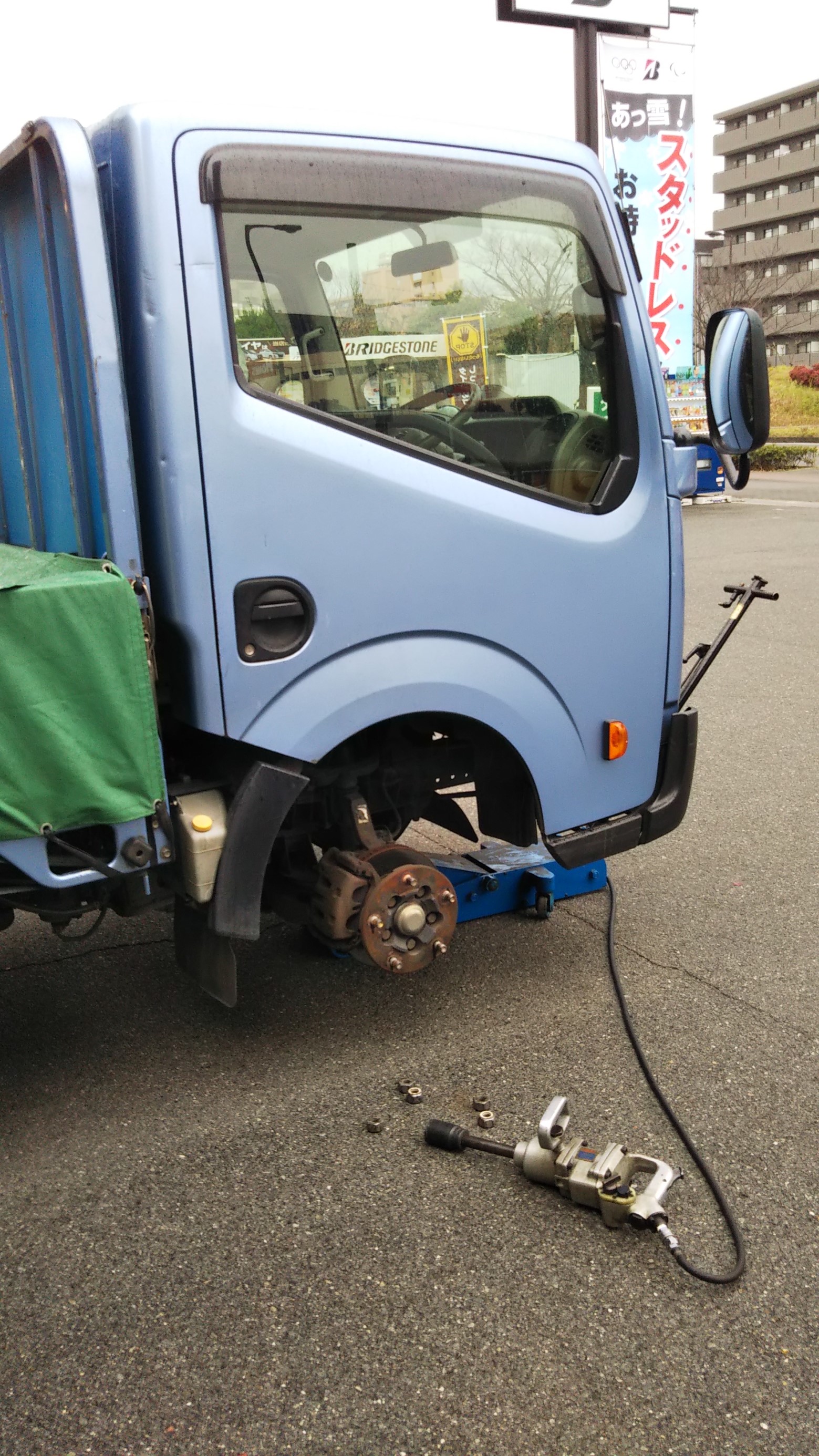 日産アトラスの2tトラック、タイヤ交換の模様です!!!