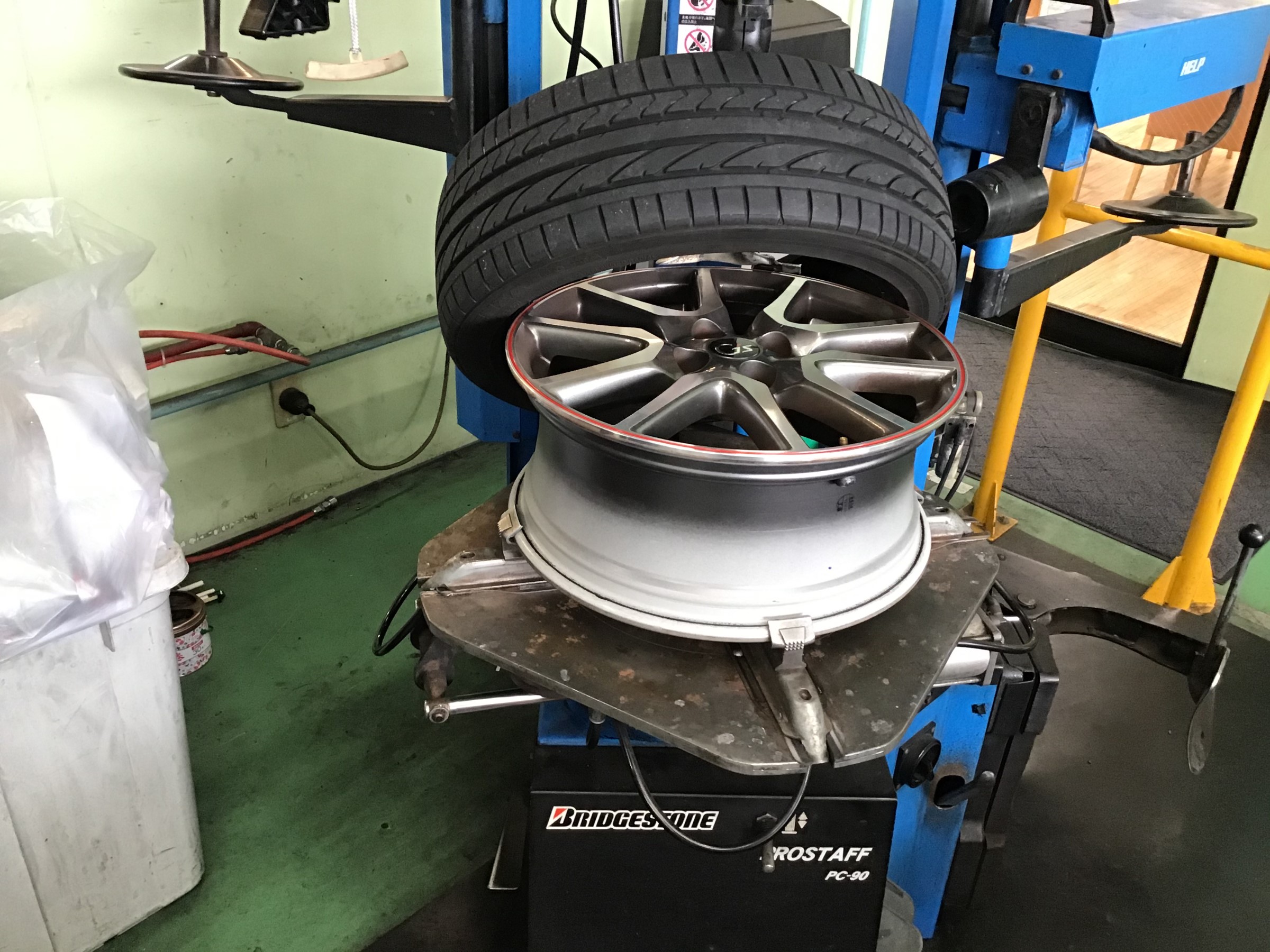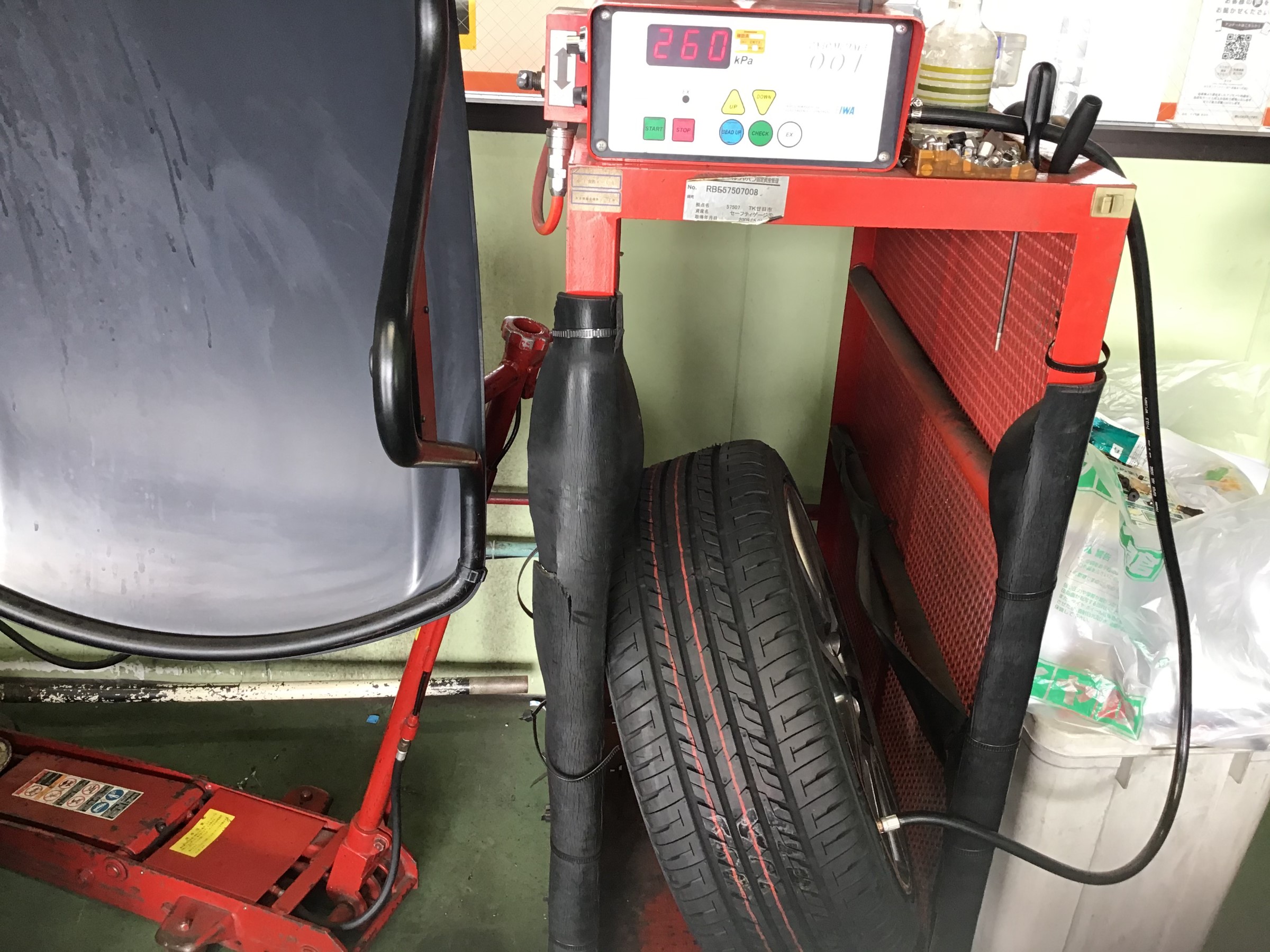 そしてタイヤを組付エア充填作業ですが、事故防止のため、必ず安全囲いの中で充填します!