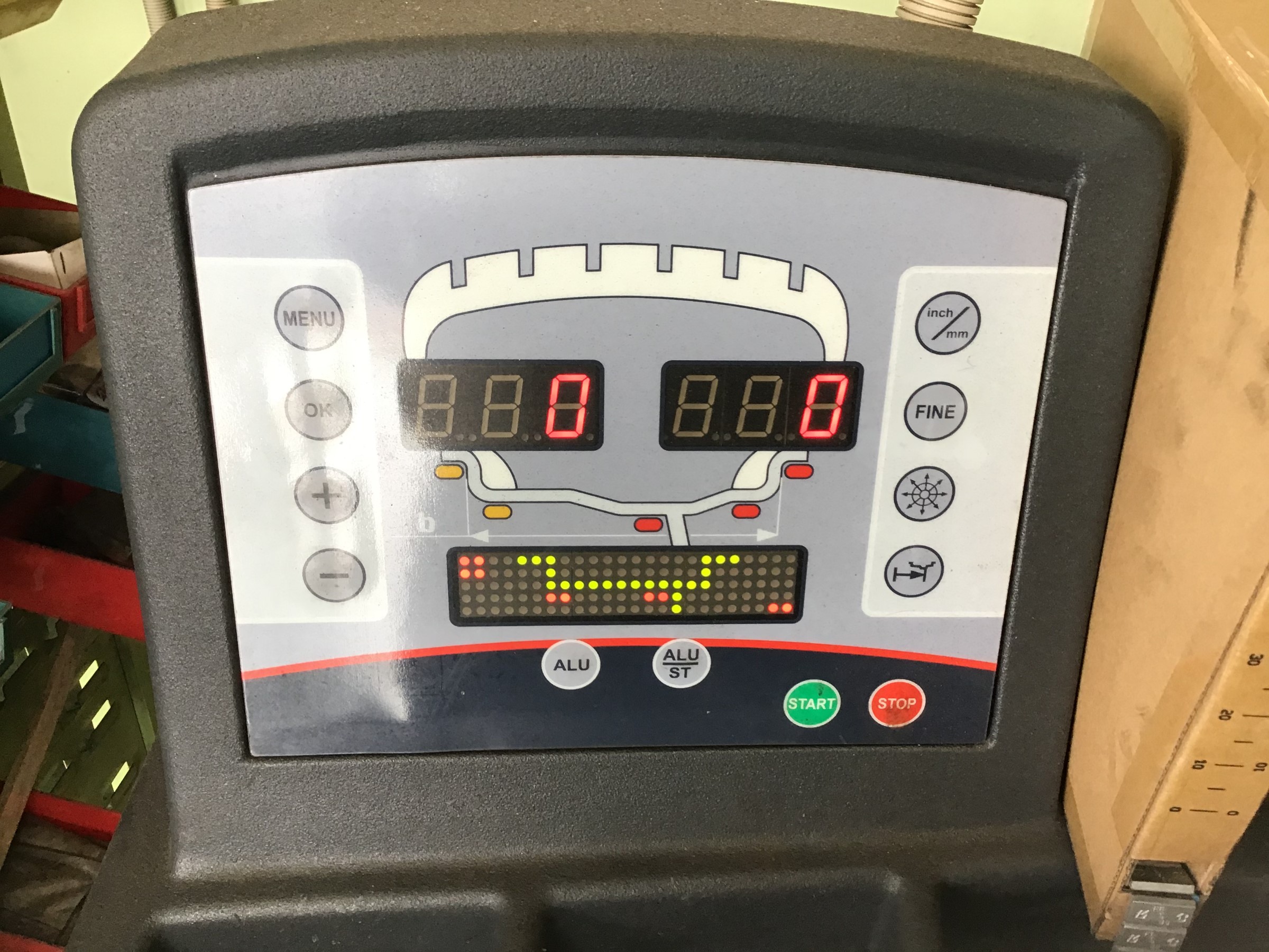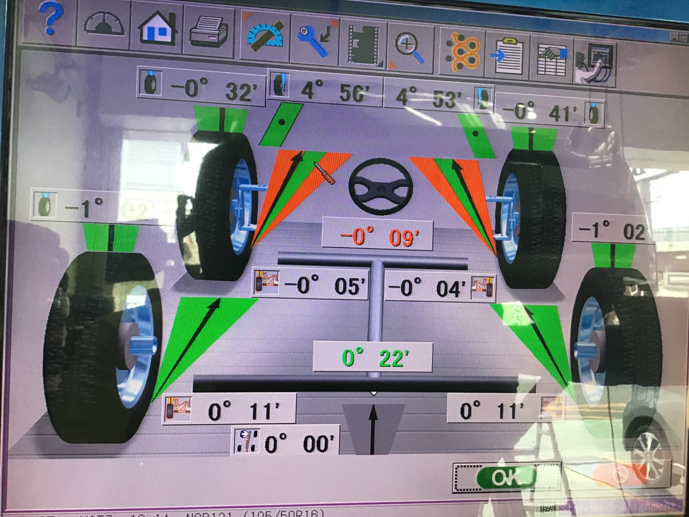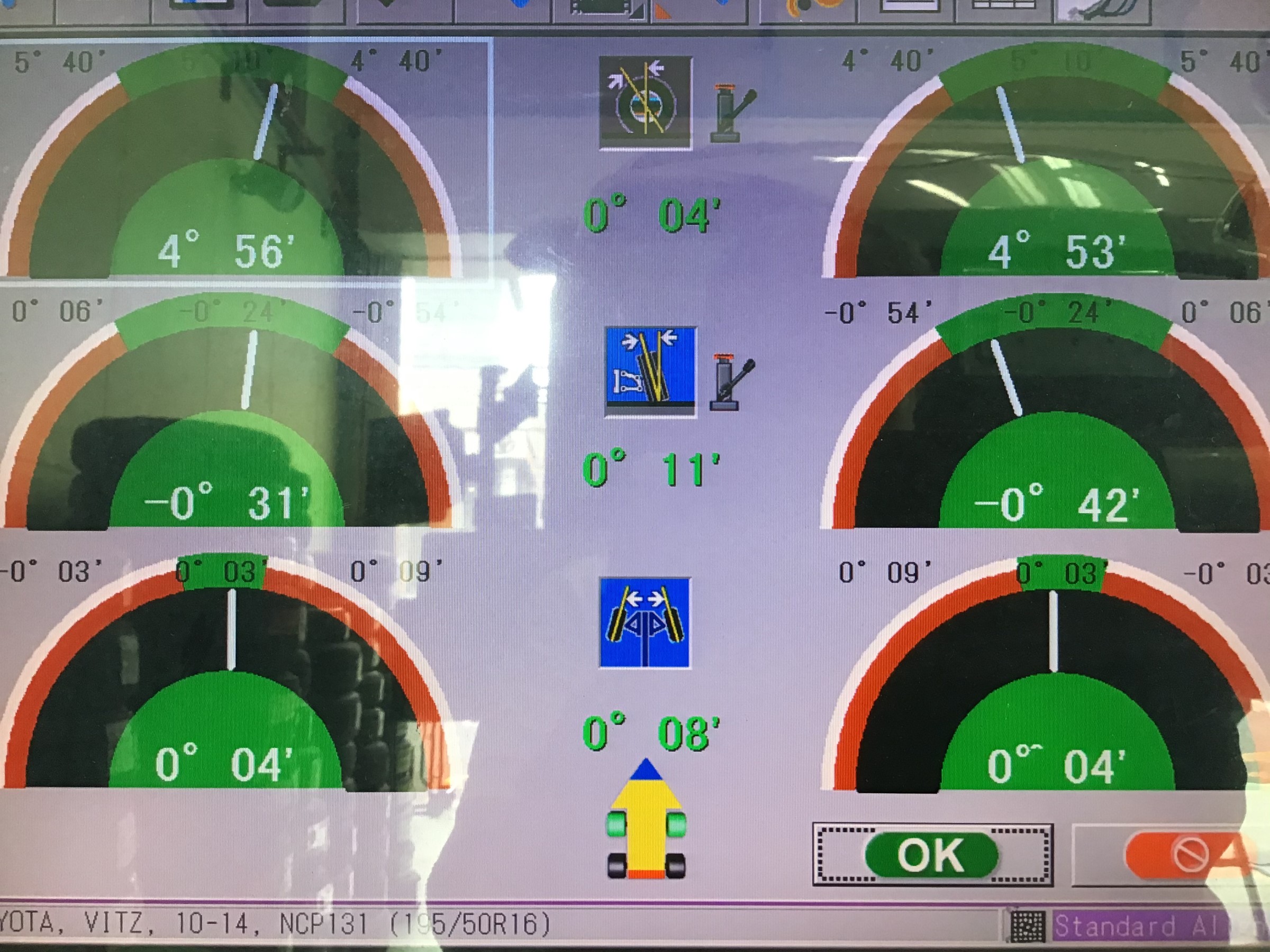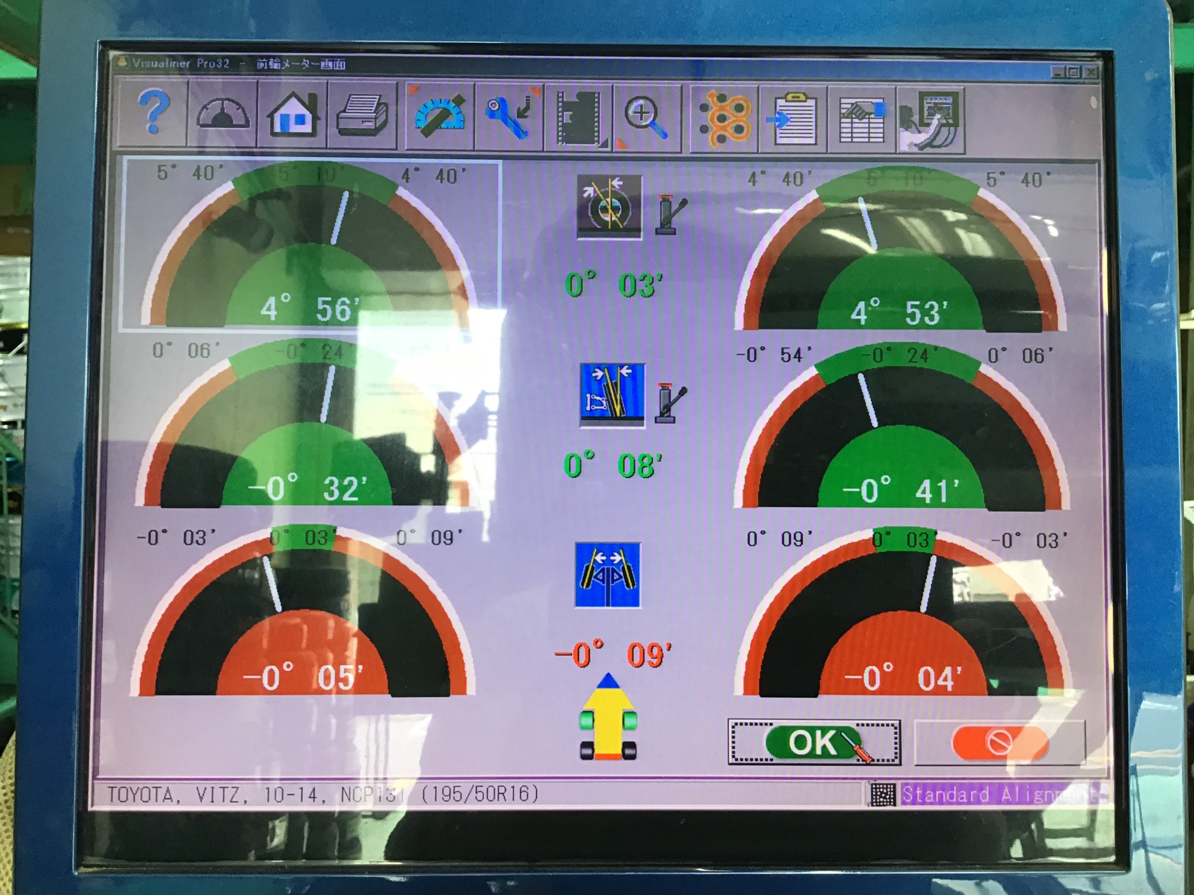 この型のお車は、フロントトーの2か所調整車ですので、フロントの画面を見てみましょう!
