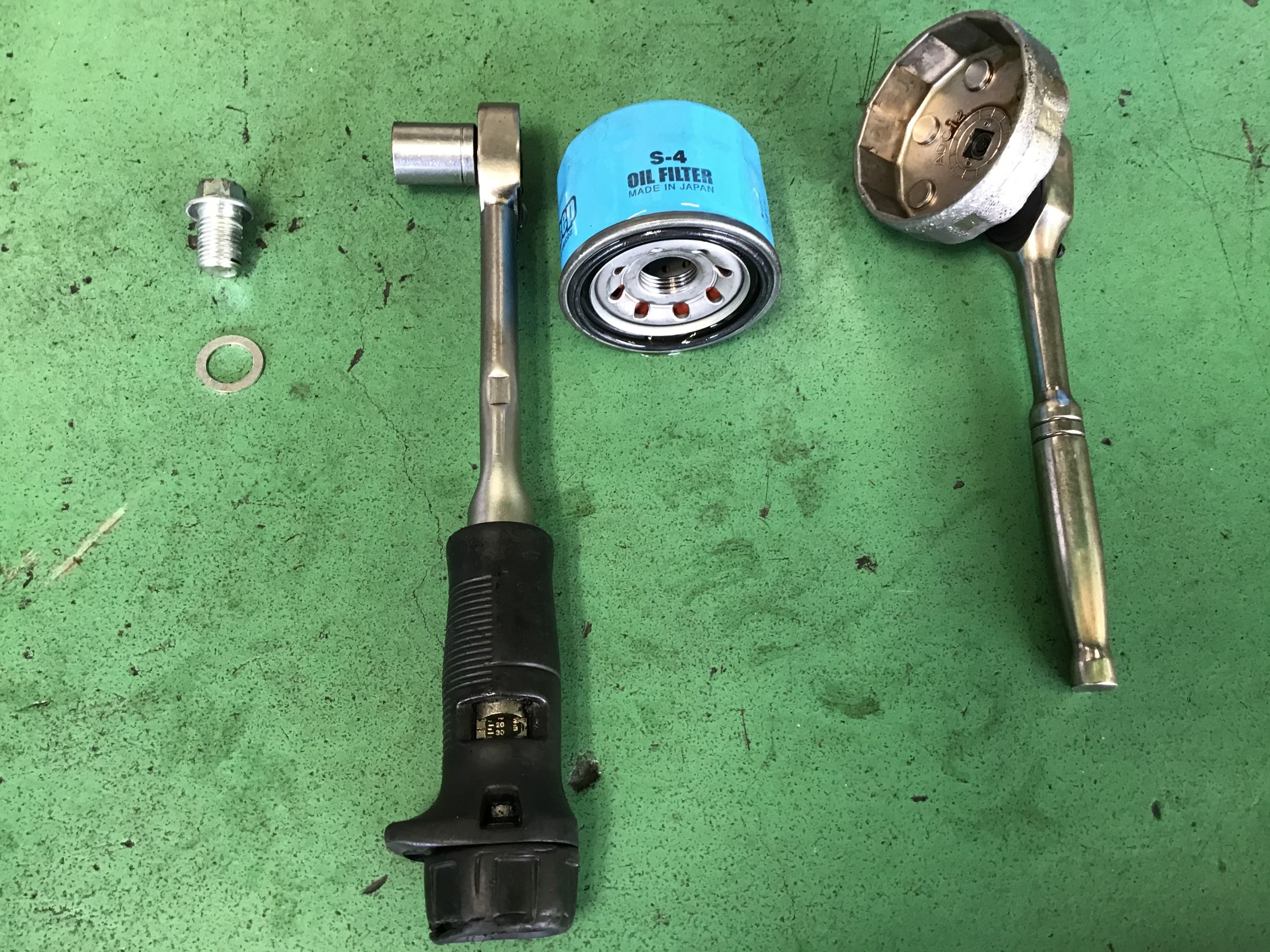 リフトアップし、ドレンボルトを緩め、古いオイルを排出します。