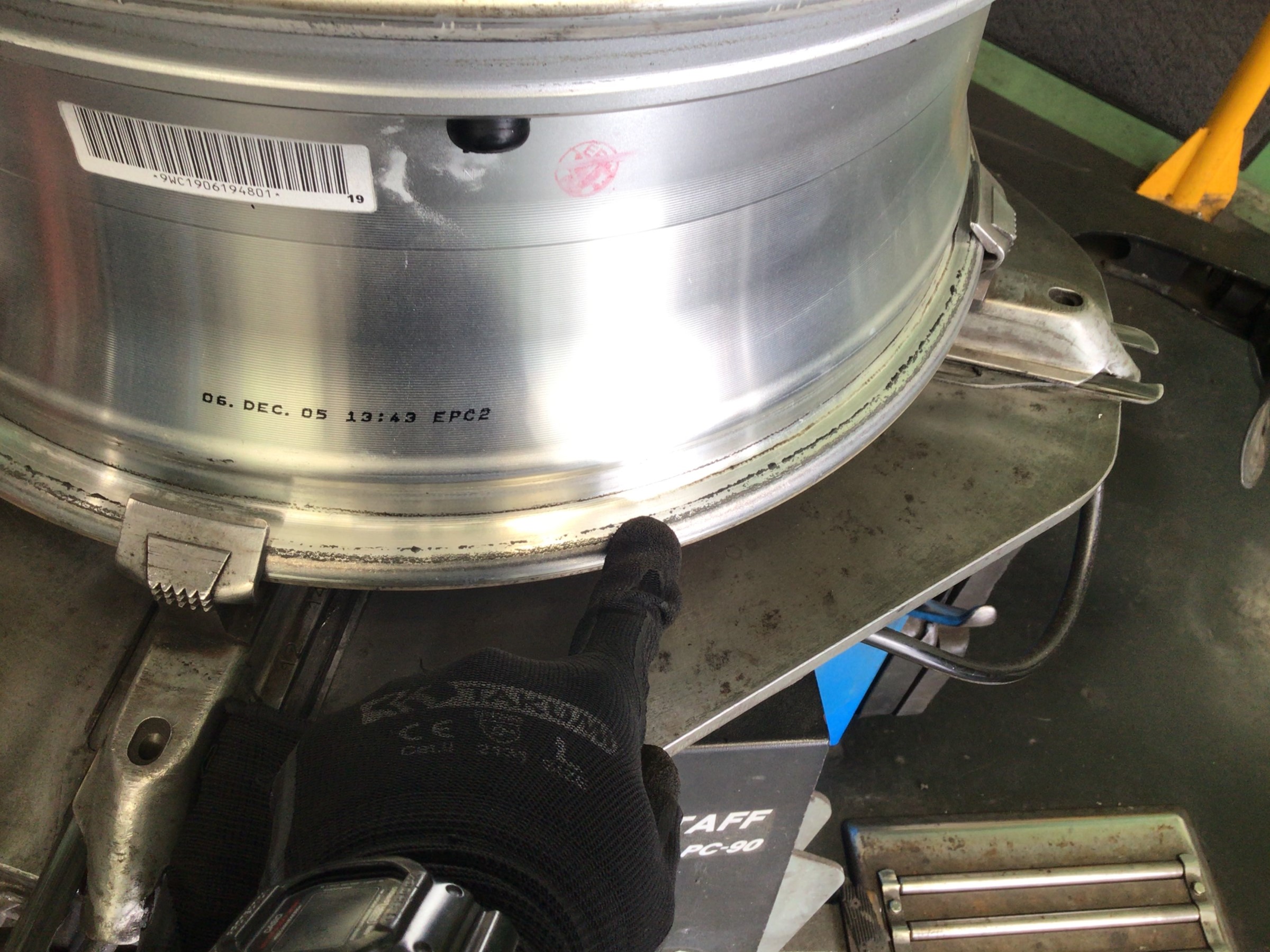 このカスが付着したままタイヤを組付けしますと、エア漏れの原因となりますで、