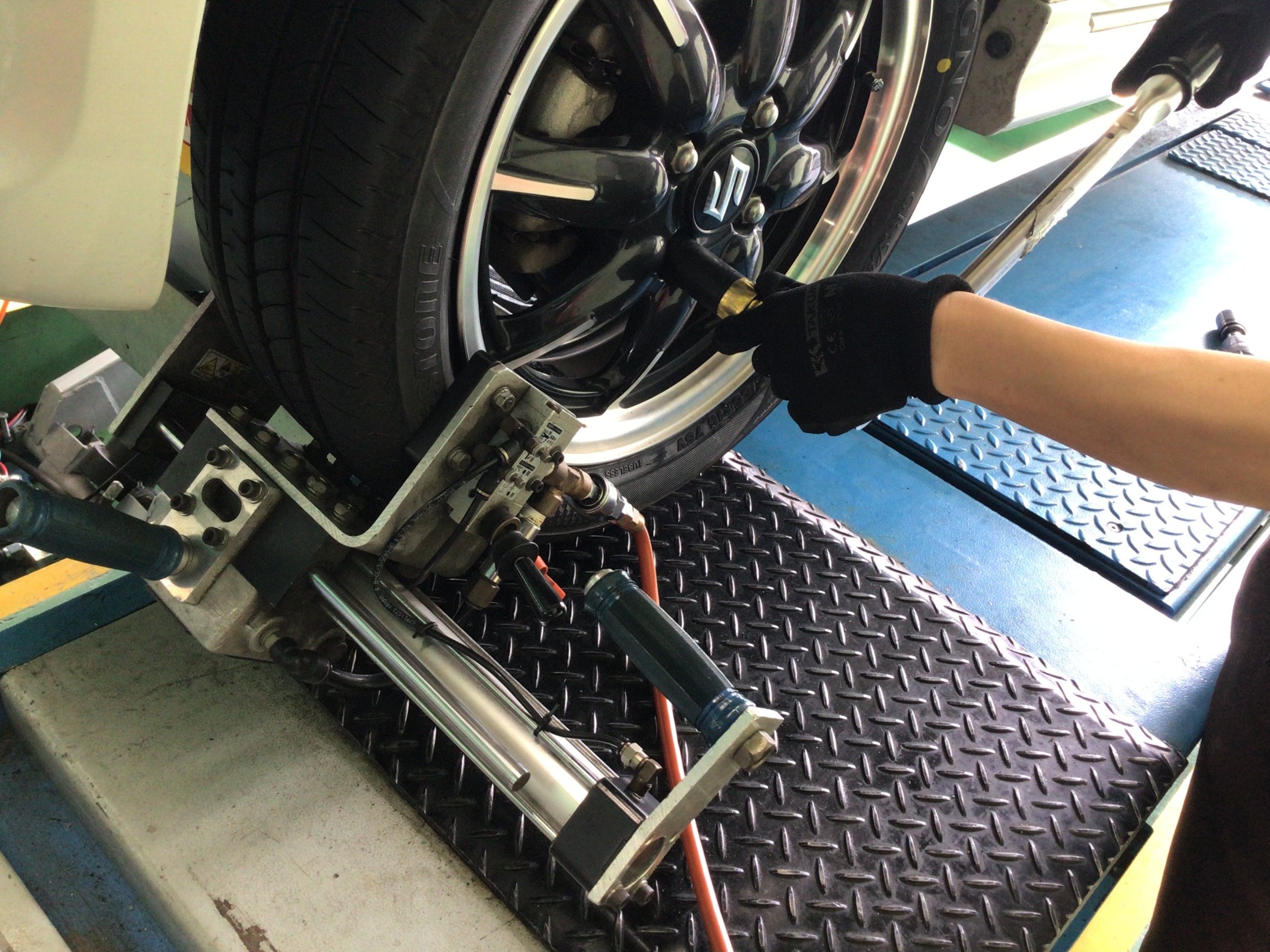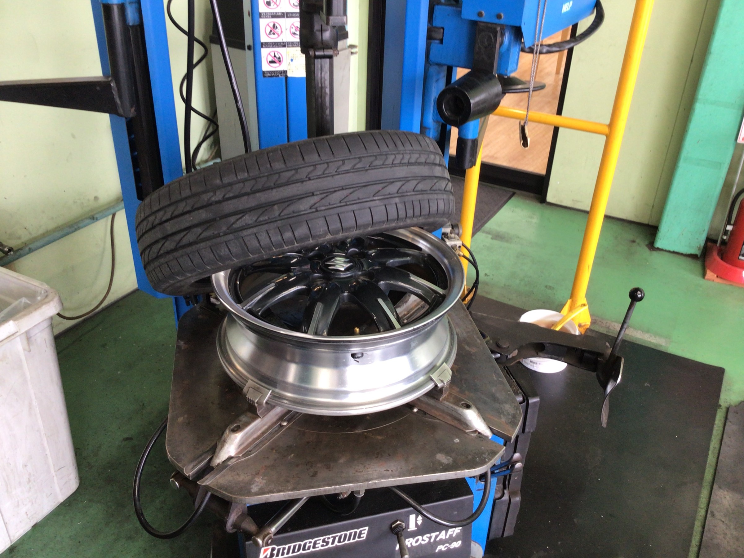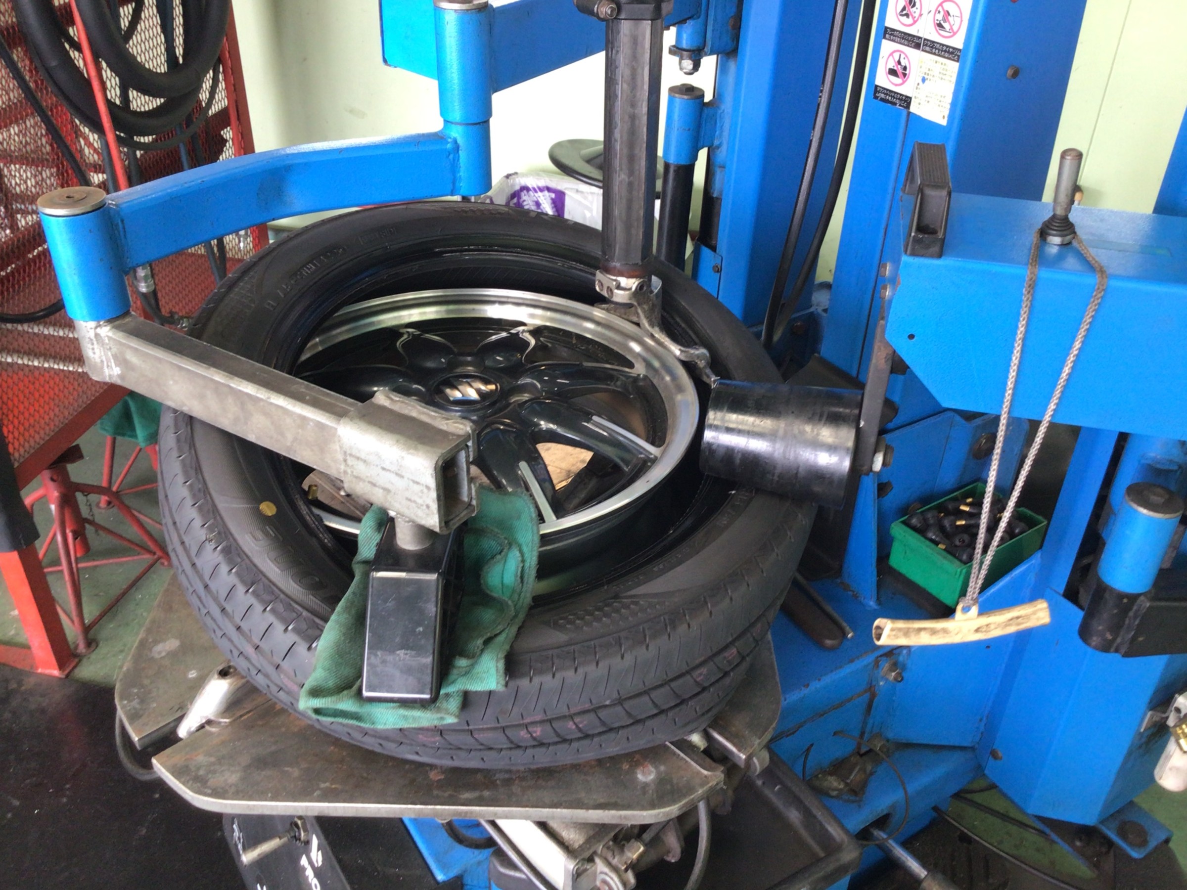 交換清掃後はタイヤを組み付けていきます。ヘルパーを使用しますが、ホイールにキズが付かないよう、