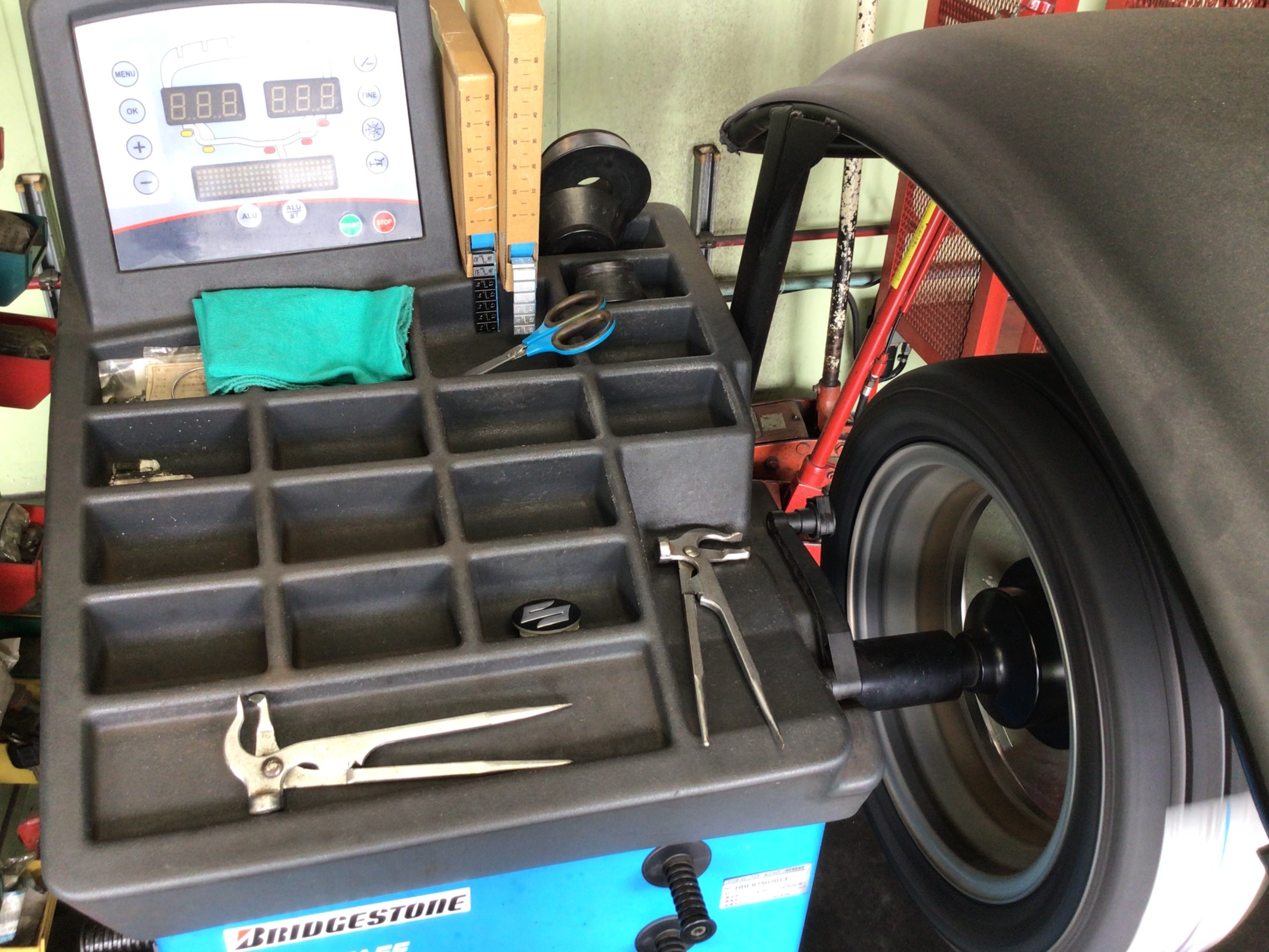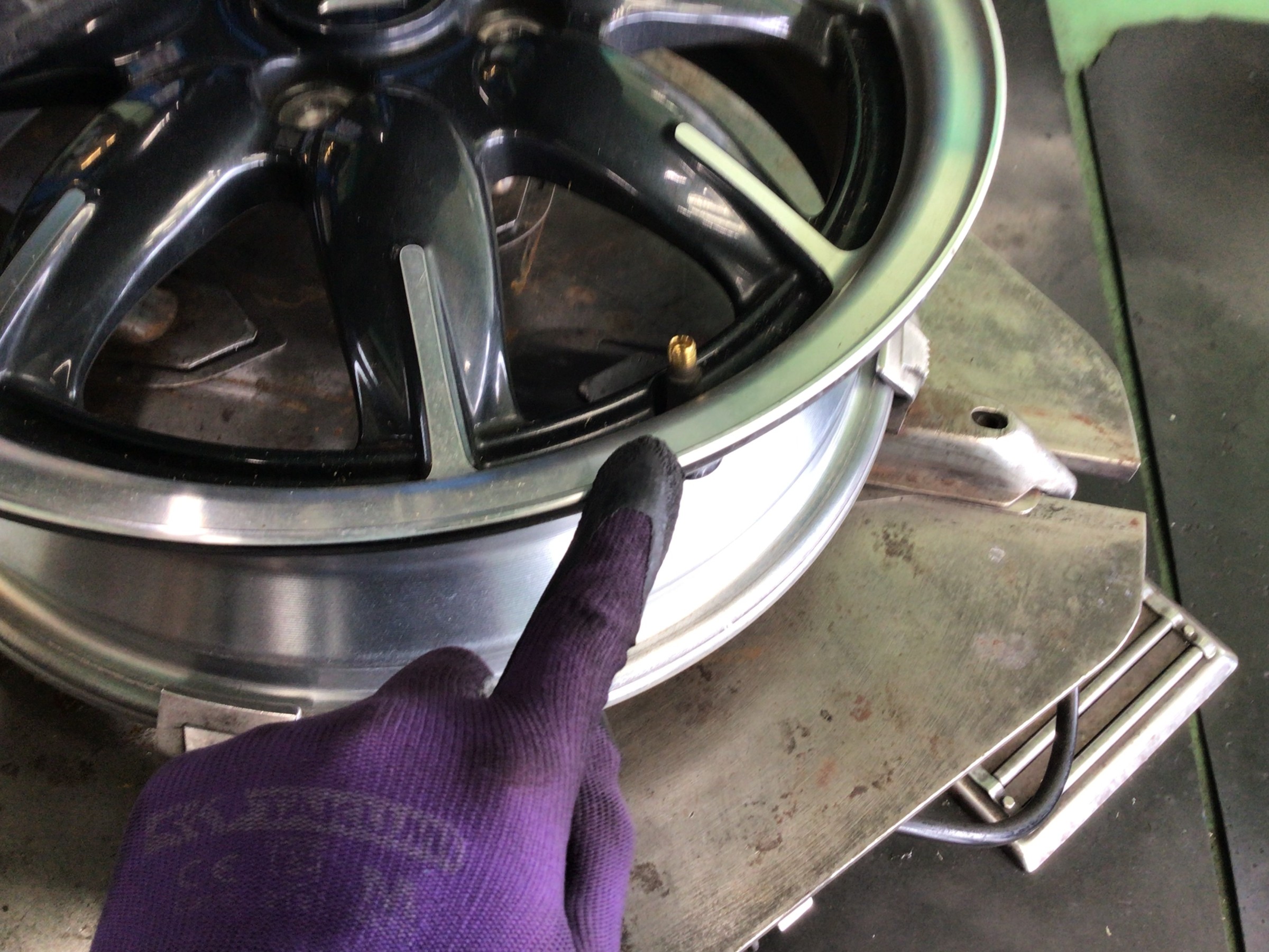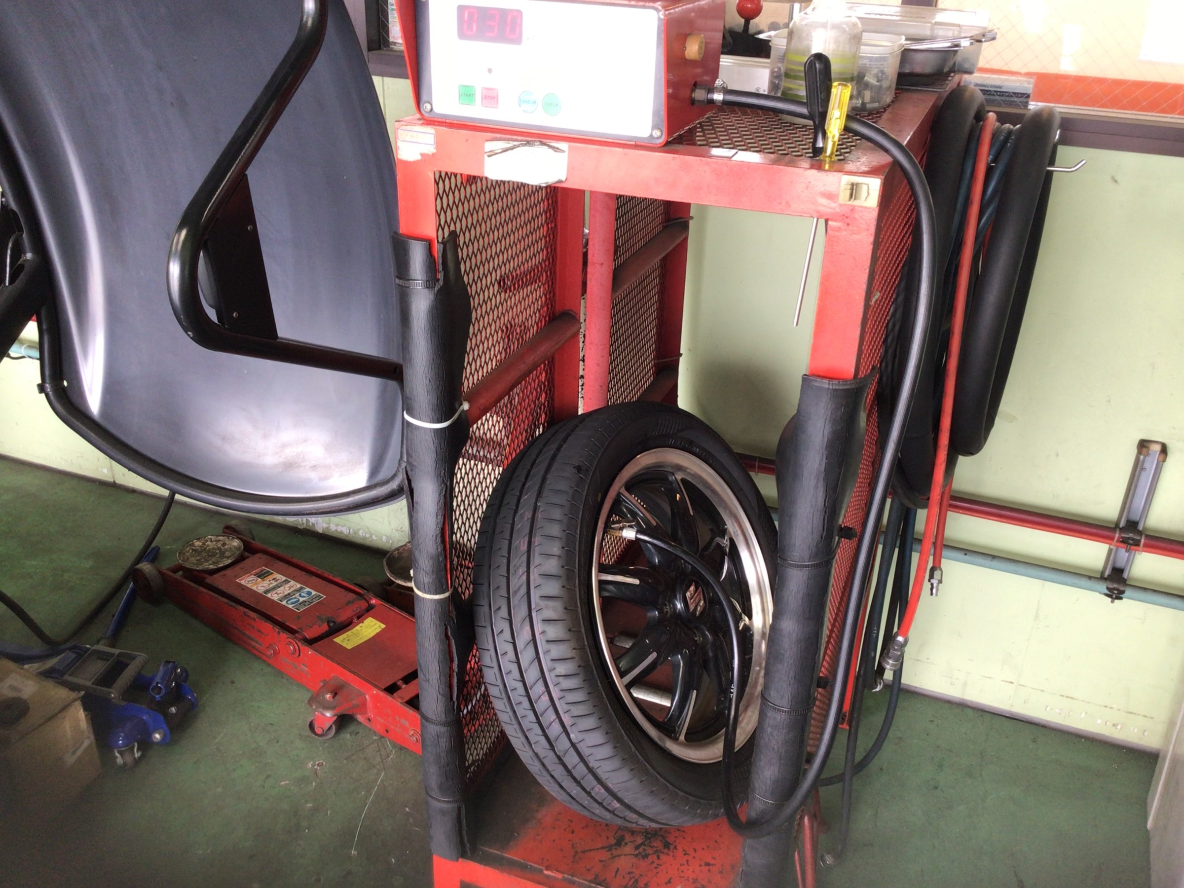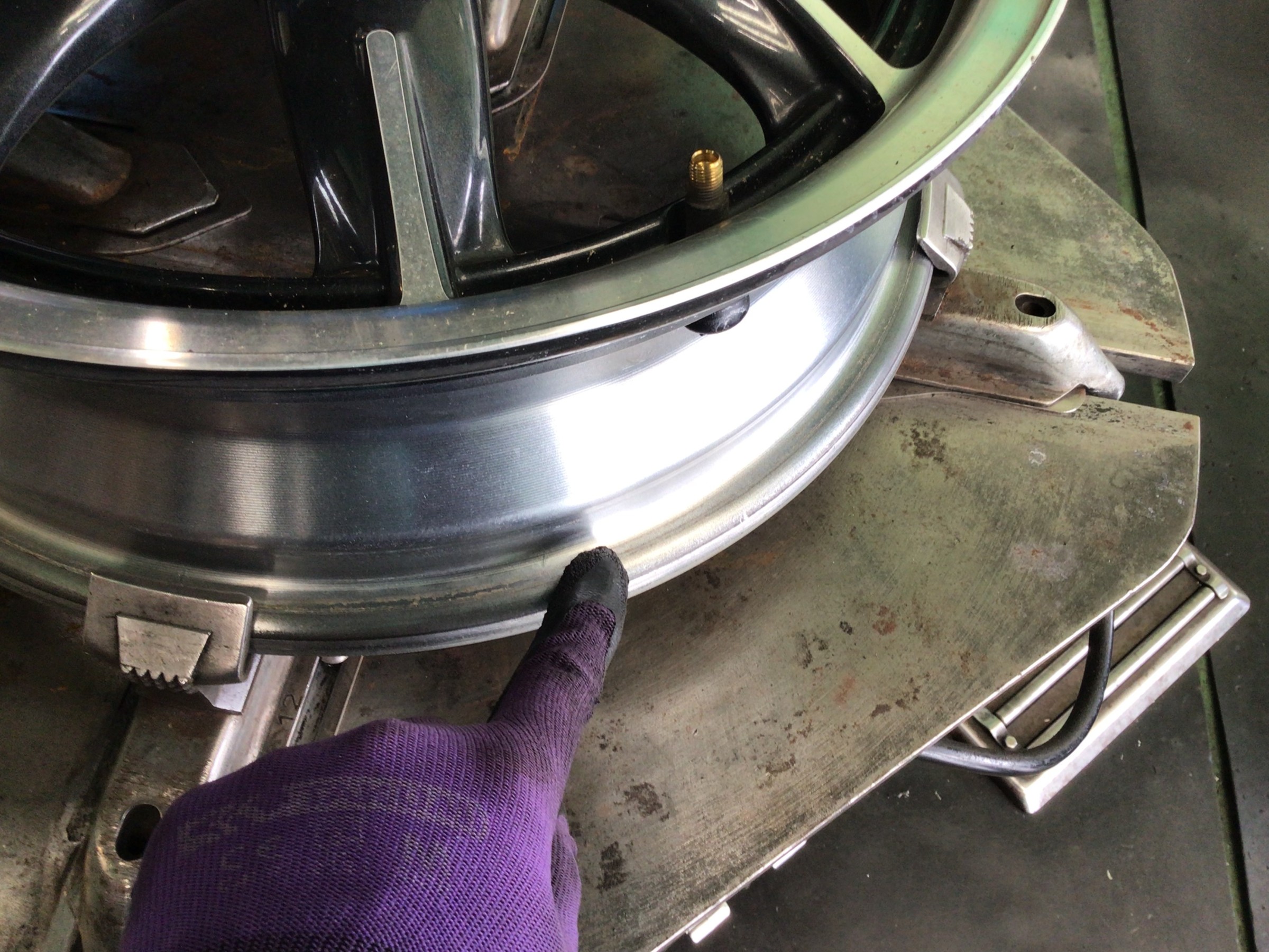 交換清掃後はタイヤを組み付けていきます。ヘルパーを使用しますが、ホイールにキズが付かないよう、