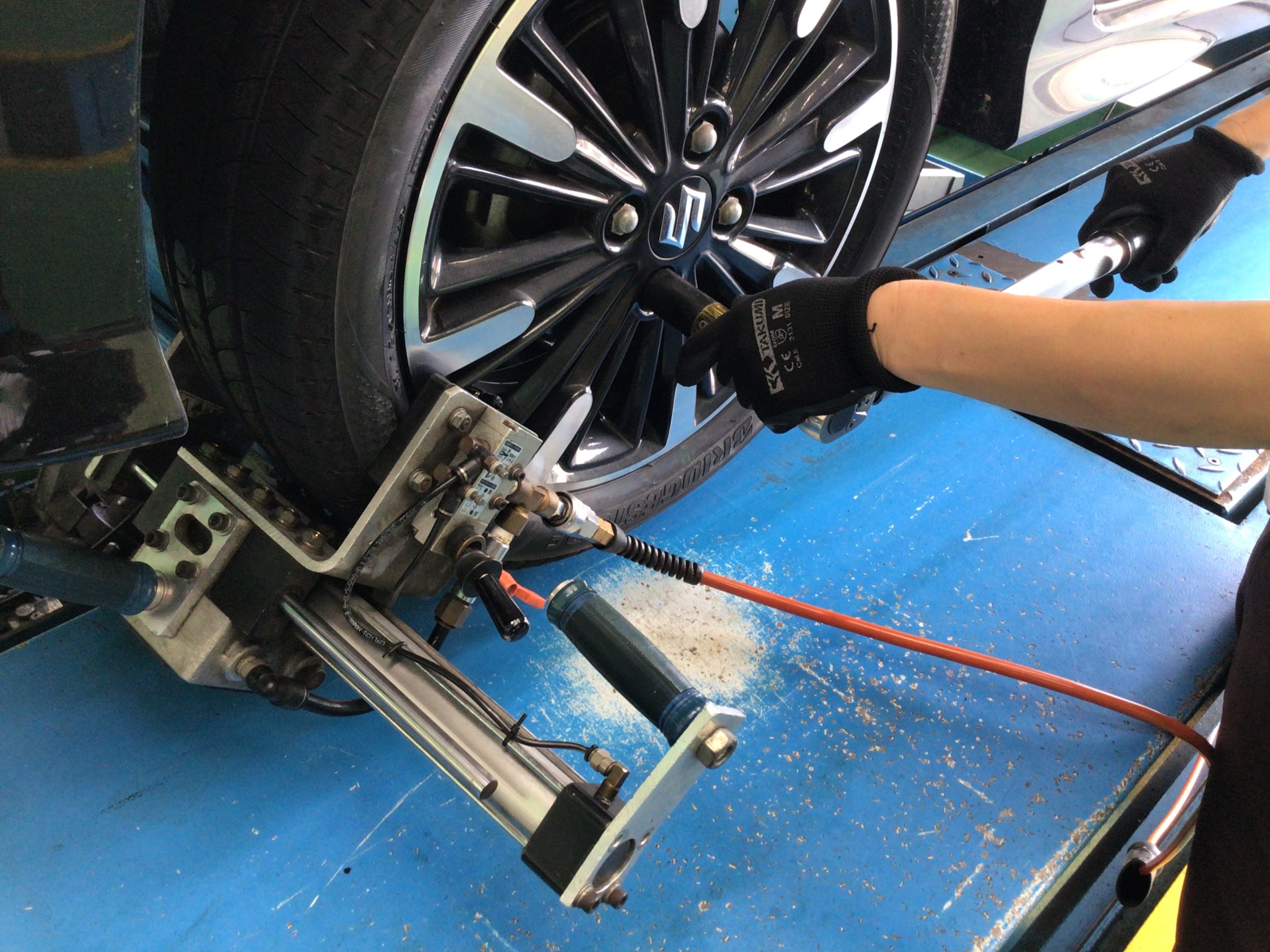 しかしこのマシンをタイヤに装着し、特殊な超微振動を与えながらナットを徐々に締め付けていきますと、