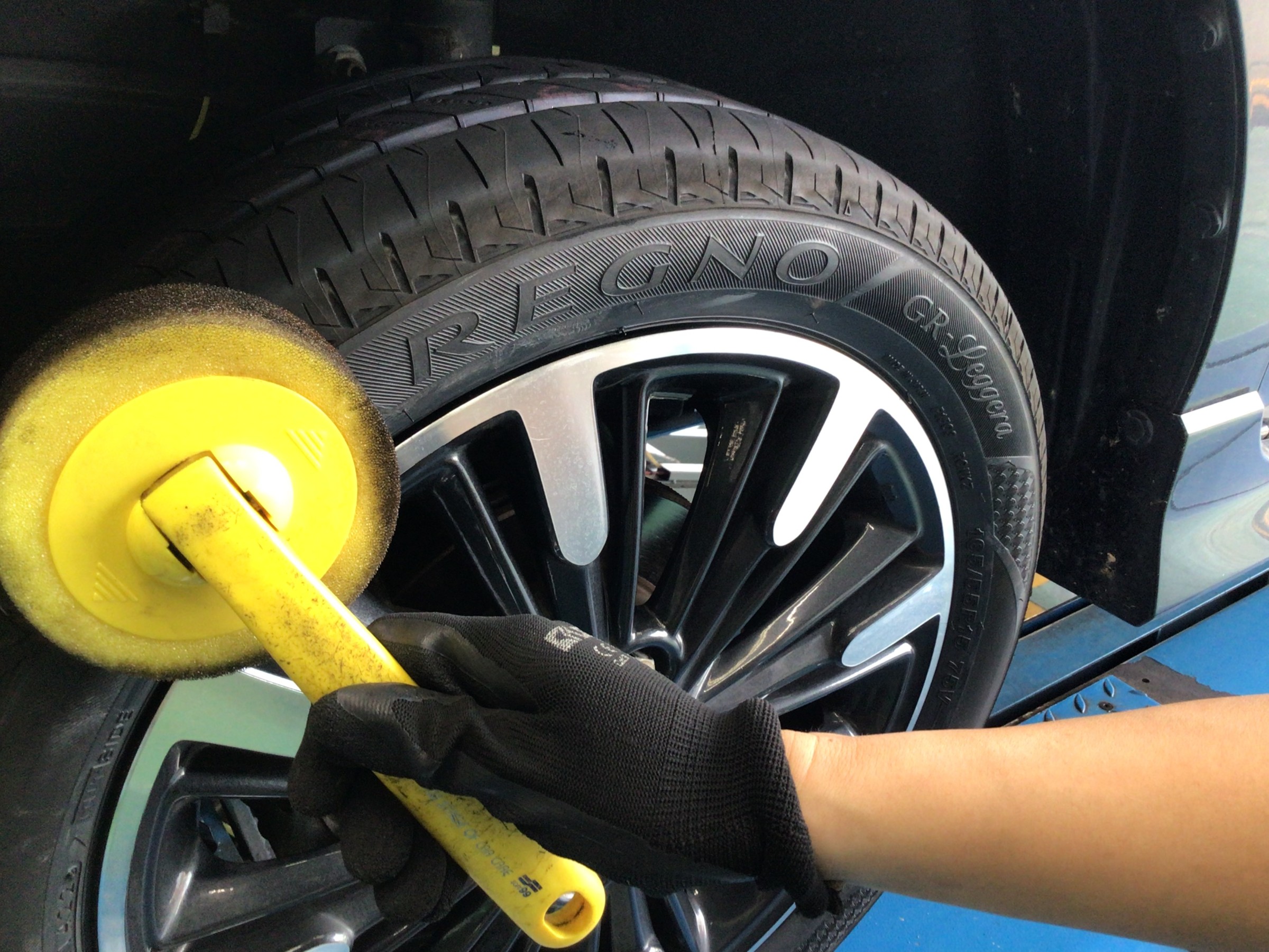 最終仕上げとしてホイールを清掃し、タイヤワックスを塗布して作業終了となります。