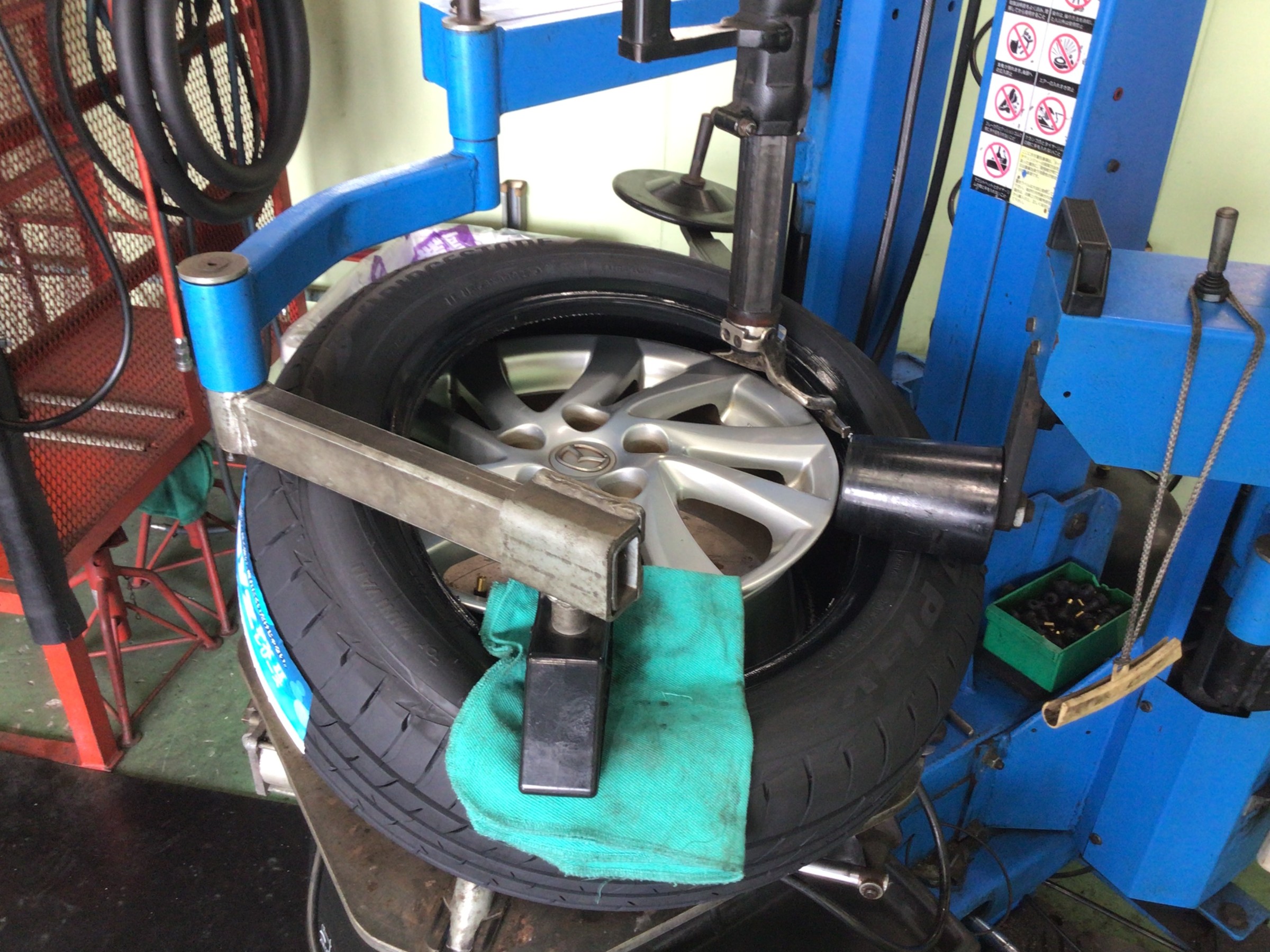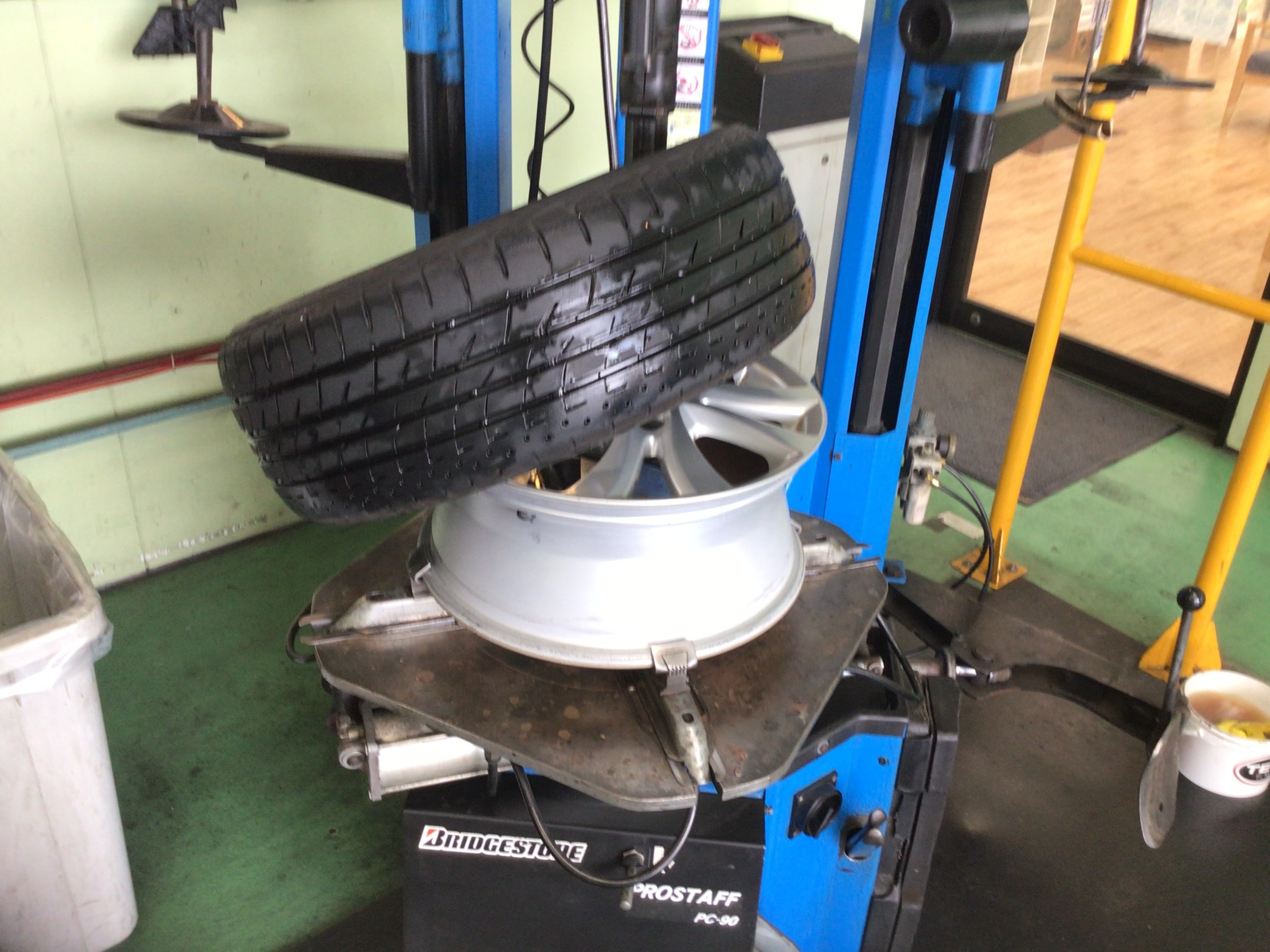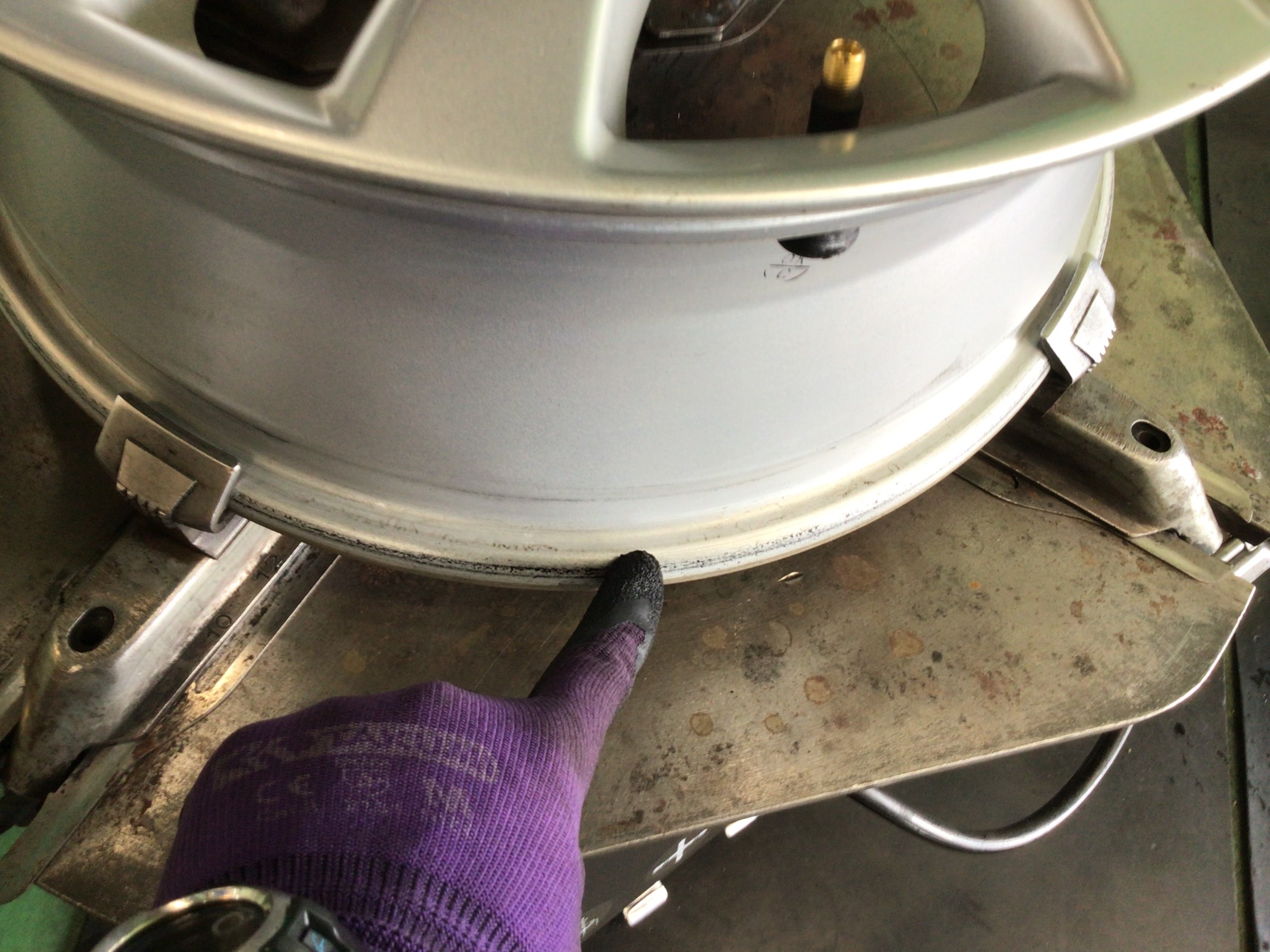 交換清掃後はタイヤを組み付けていきます。ヘルパーを使用しますが、ホイールにキズが付かないよう、