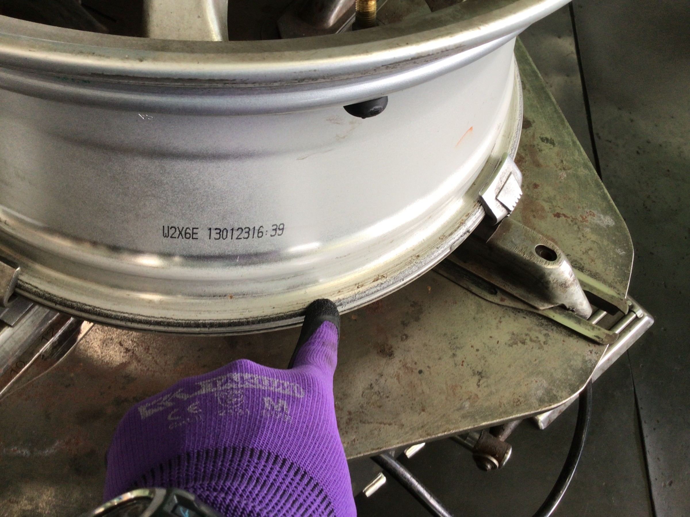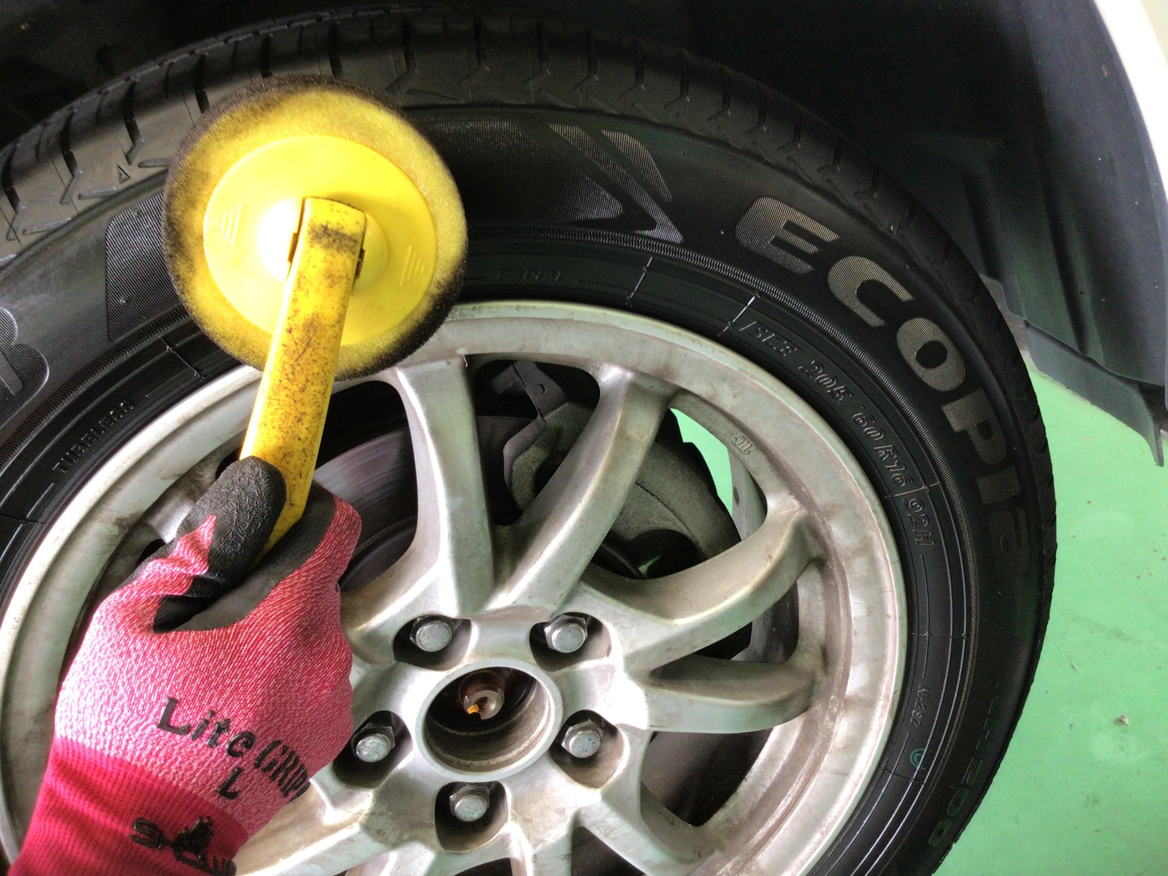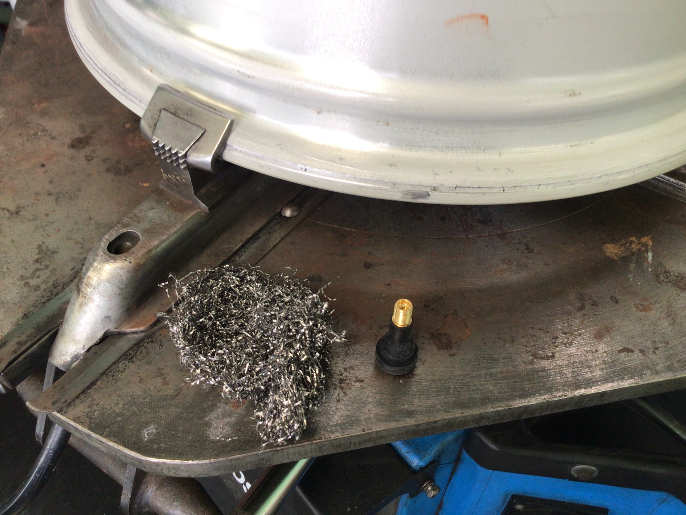 作業続きです。外したホイールのリム部に付着したカスを清掃します。