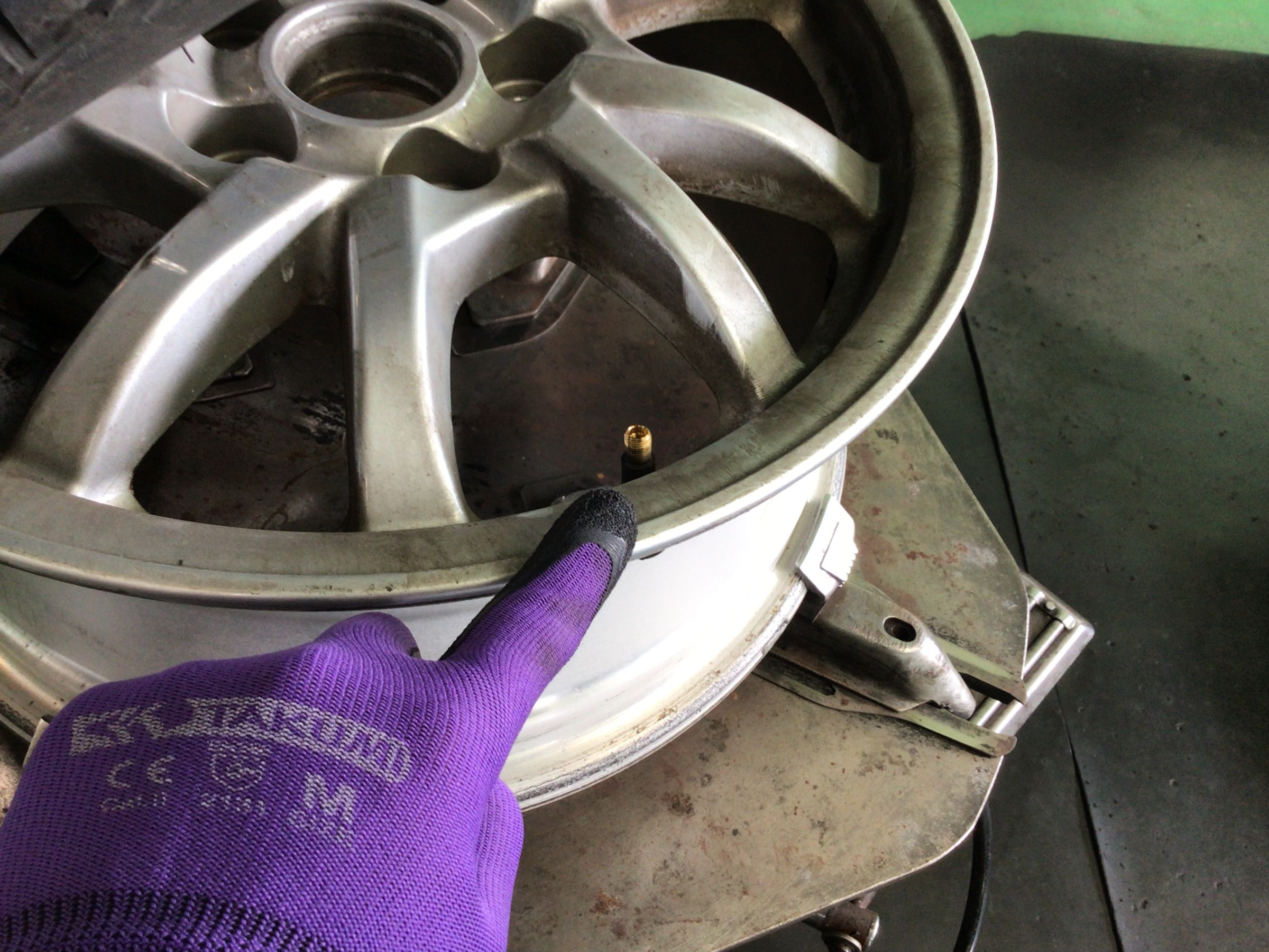 このカスが付着したままタイヤを組み付けますとエア漏れの原因となりますので、