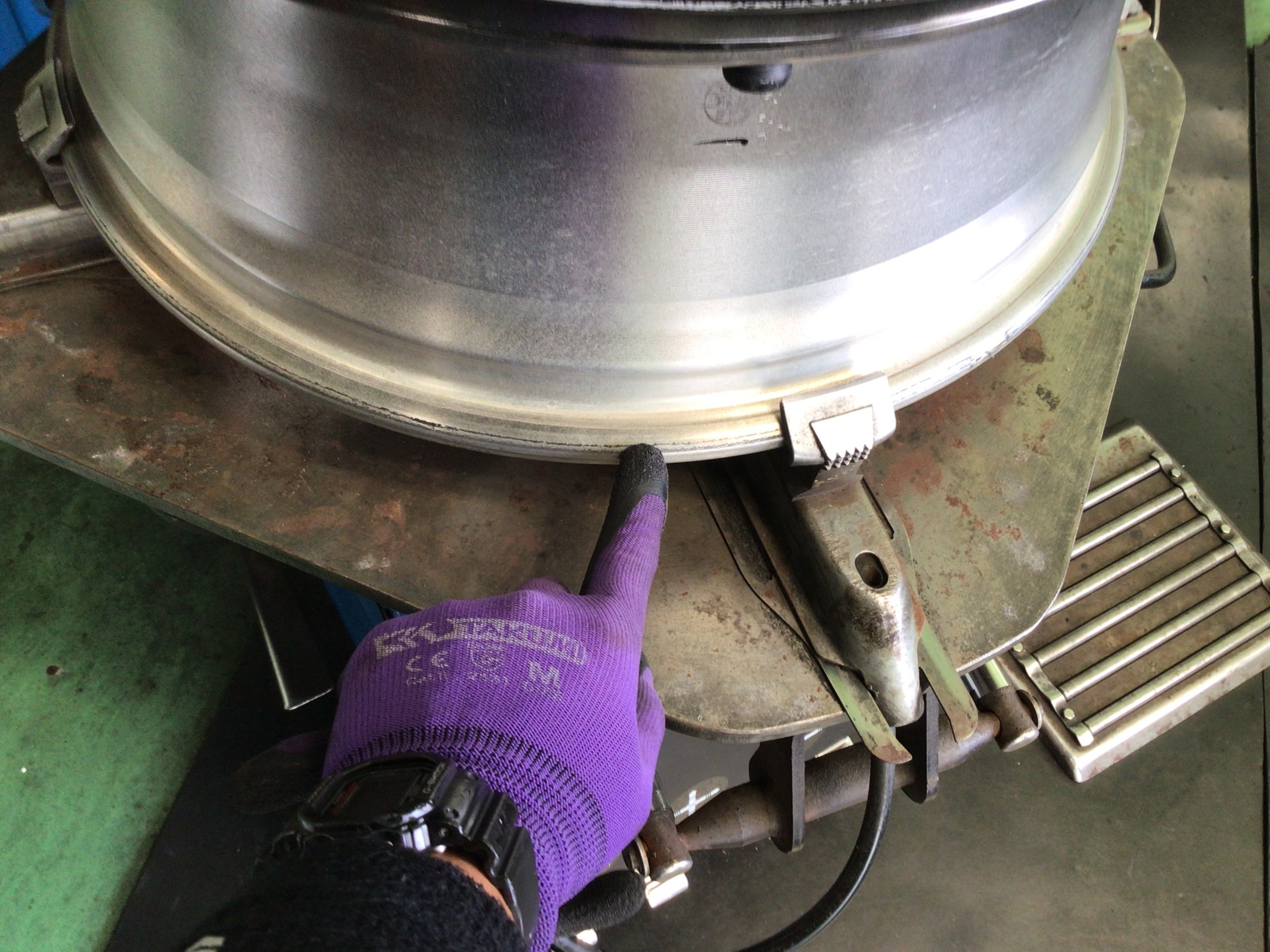 外したホイールのリム部に付着したカスを清掃します。