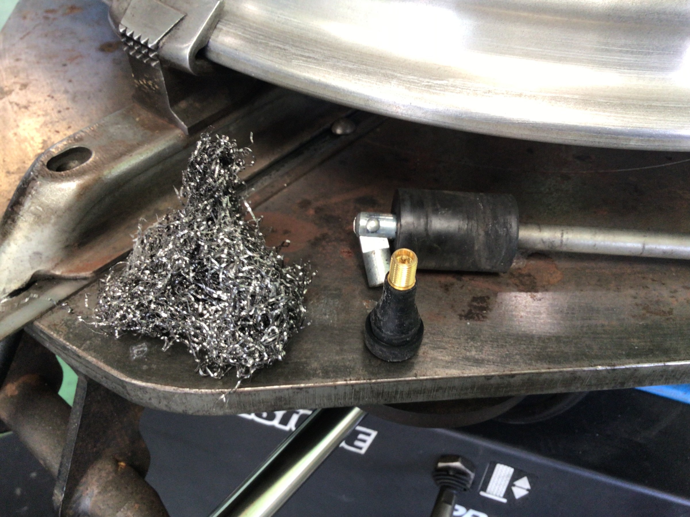 このカスが付着したままタイヤを組み付けますとエア漏れの原因となりますので、