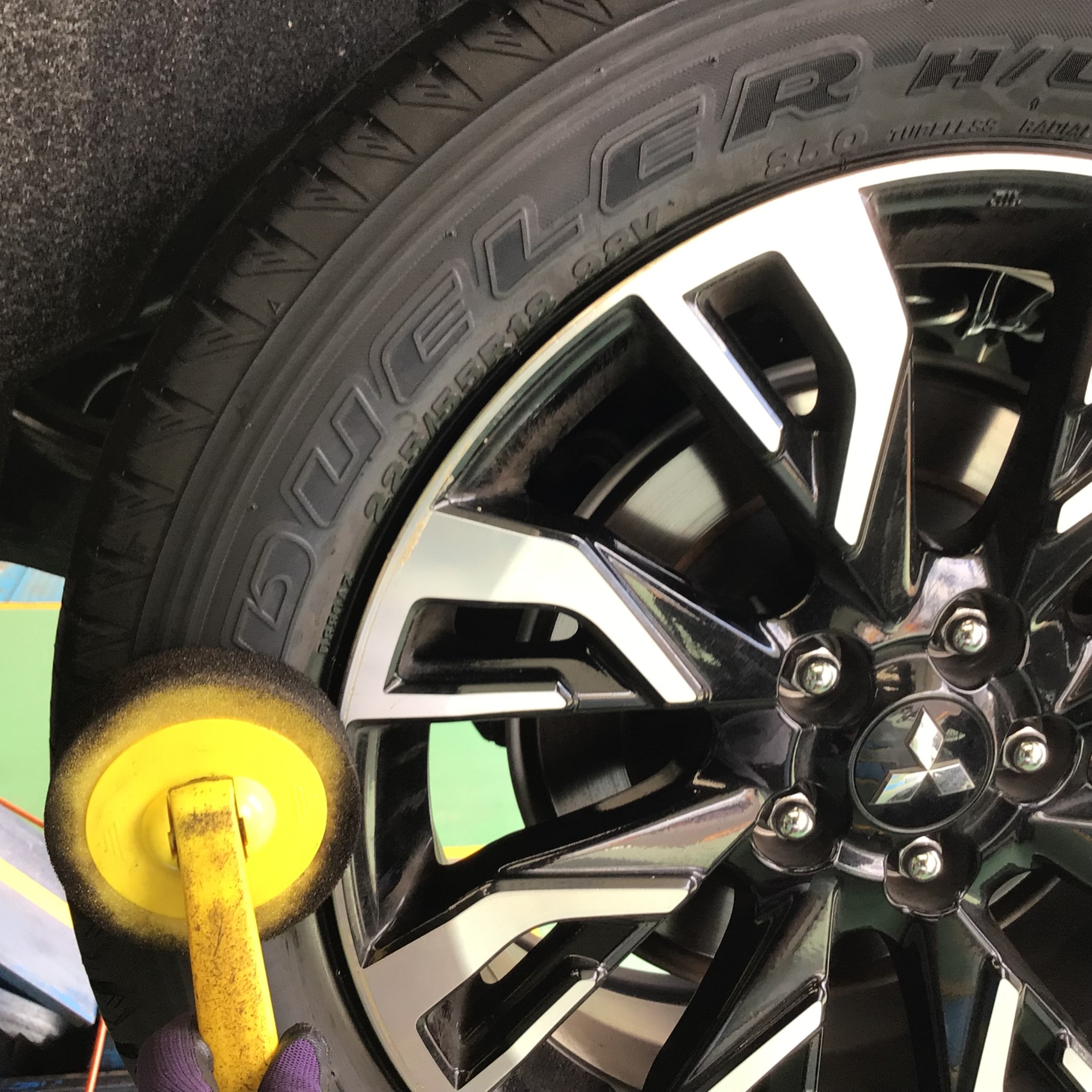 最終仕上げとしてホイールを清掃し、タイヤワックスを塗布して作業終了となります。