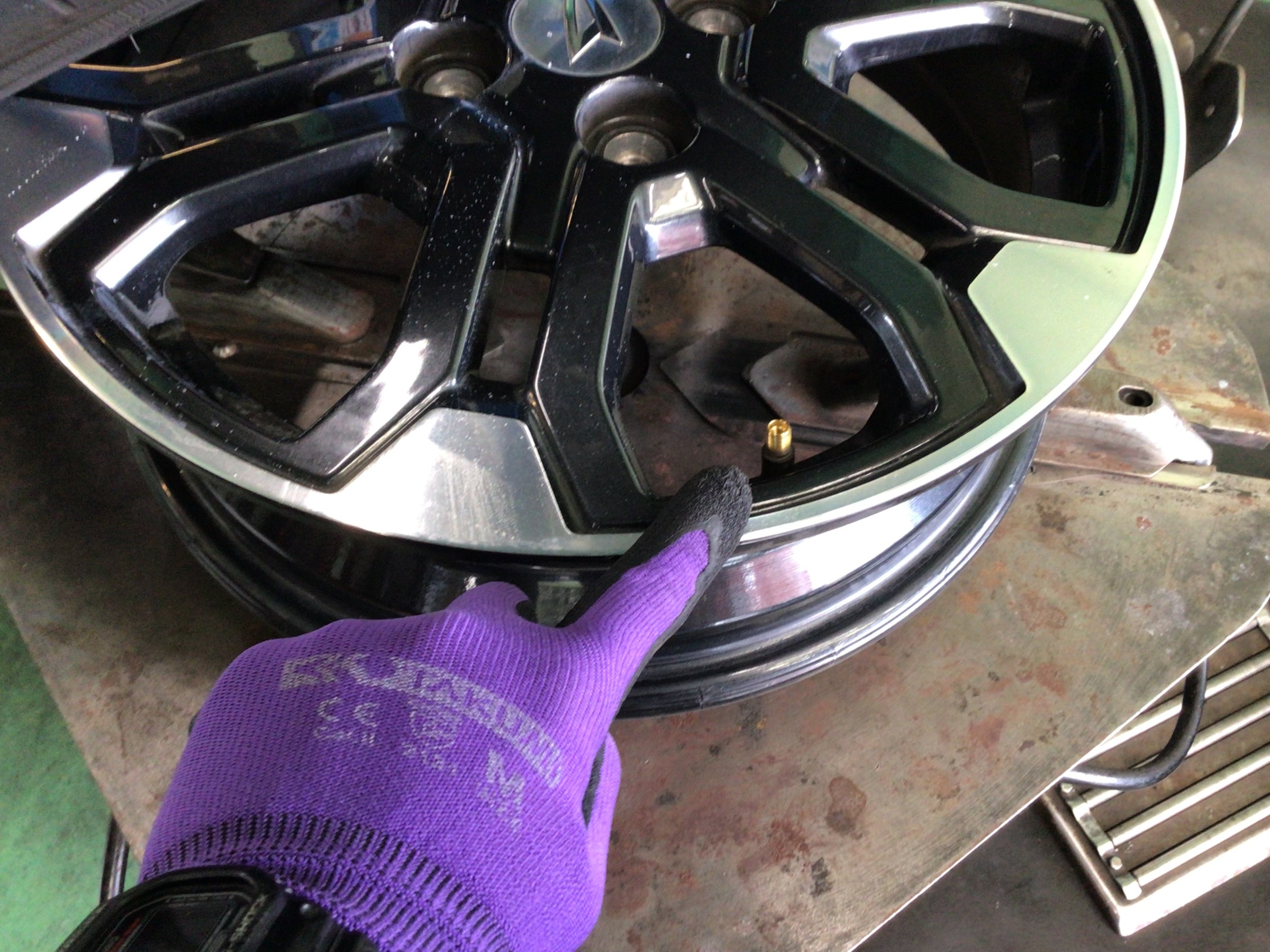 作業続きです。外したホイールのリム部に付着したカスを清掃します。