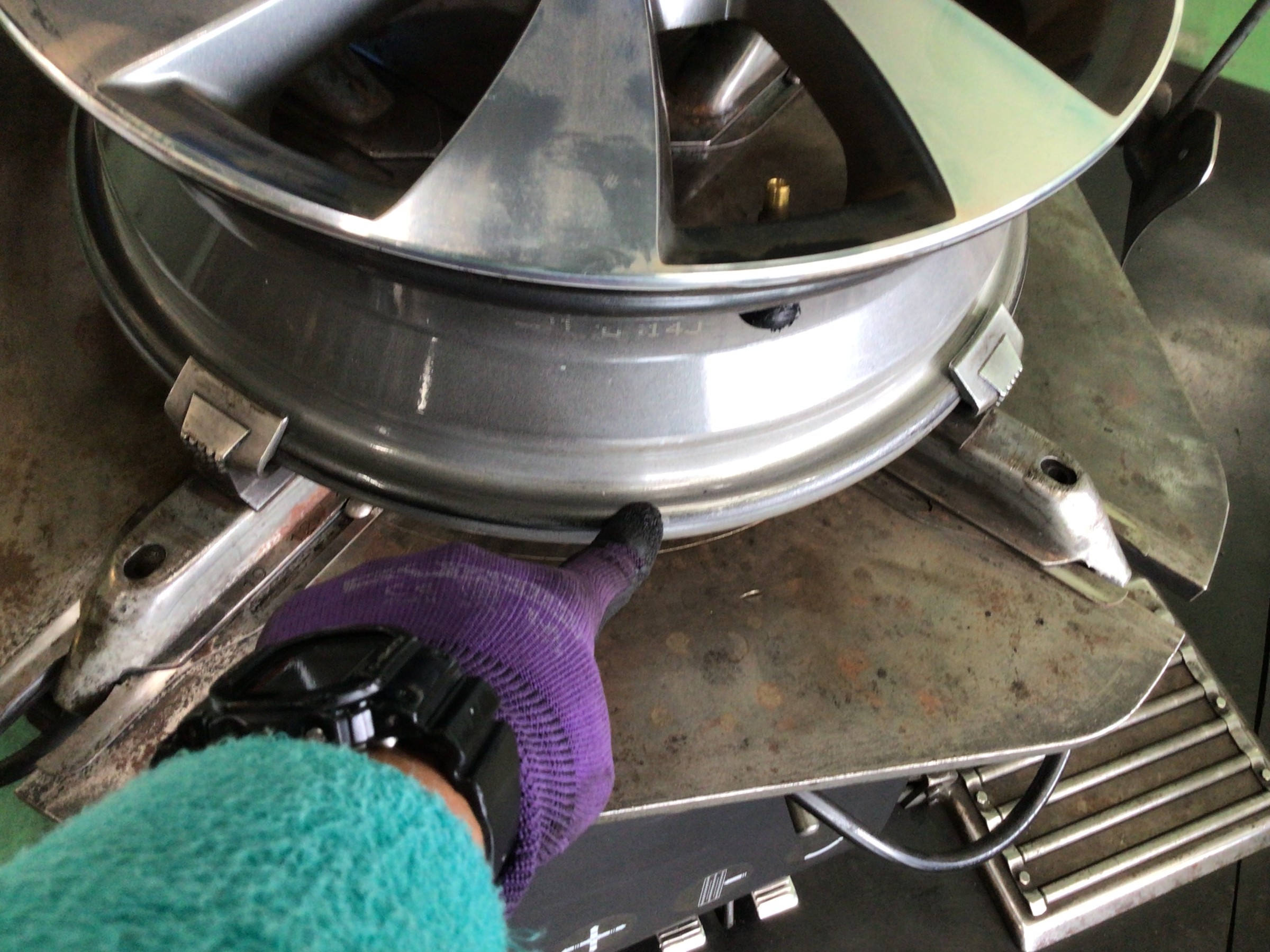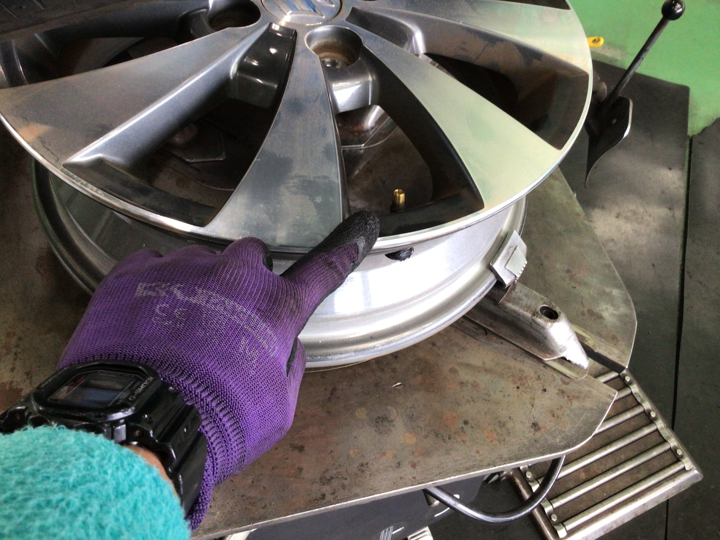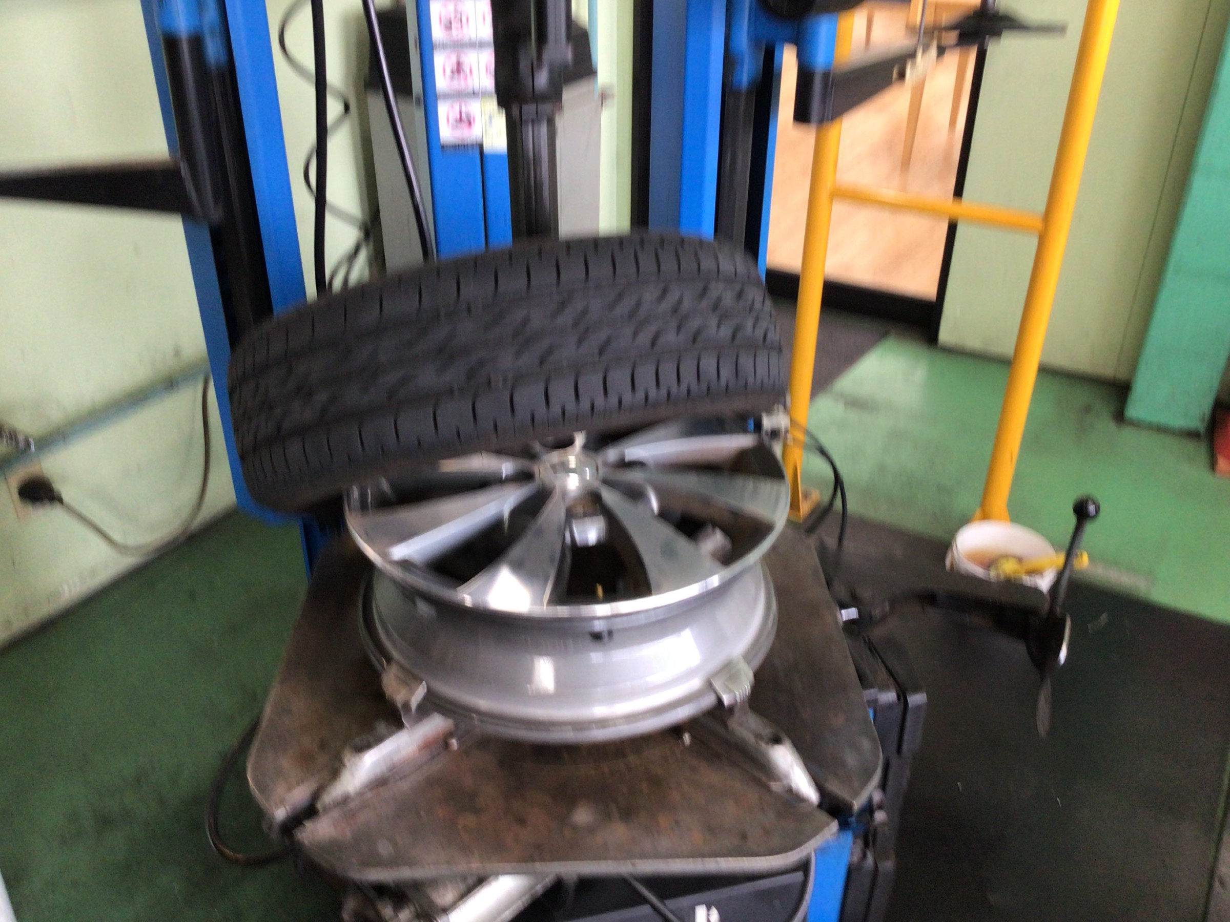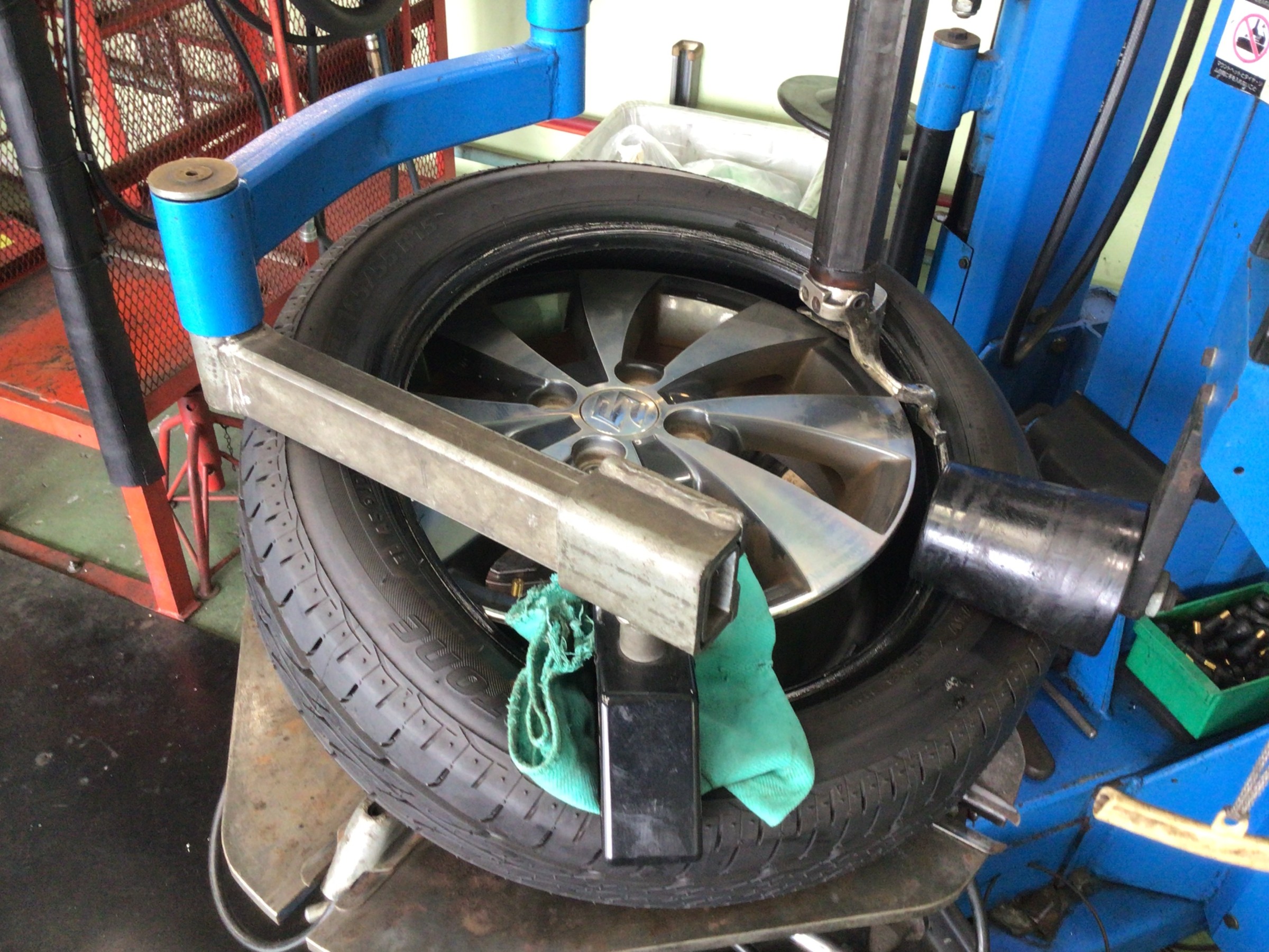 交換清掃後はタイヤを組み付けていきます。ヘルパーを使用しますが、ホイールにキズが付かないよう、