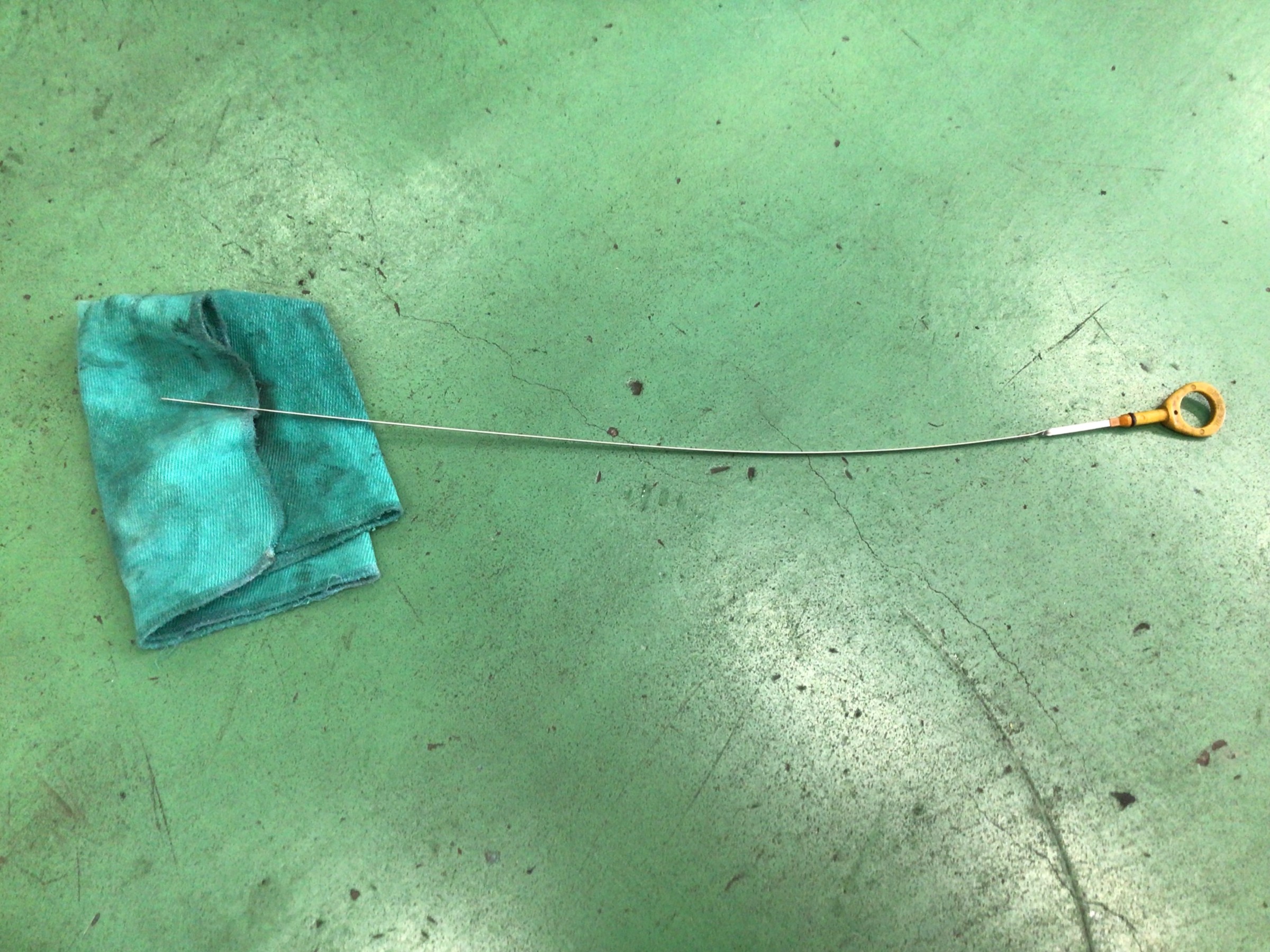 当店のオイル交換の手順をご紹介しますね!まず交換前にオイルの量と汚れをチェックします。