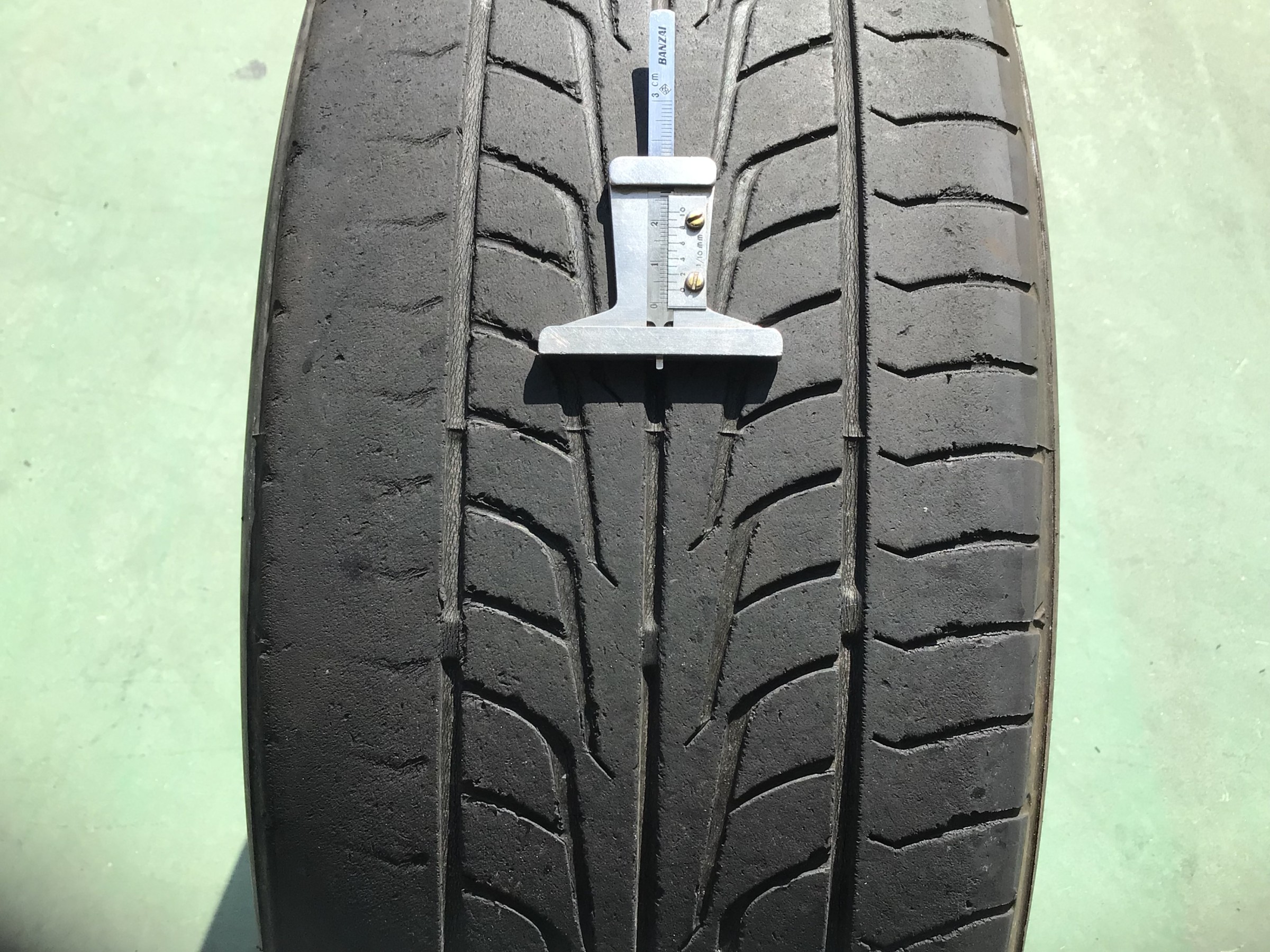 残溝平均・・・ツルツルっでした。。。画面左のタイヤの外側は限界ギリギリです(;'∀')