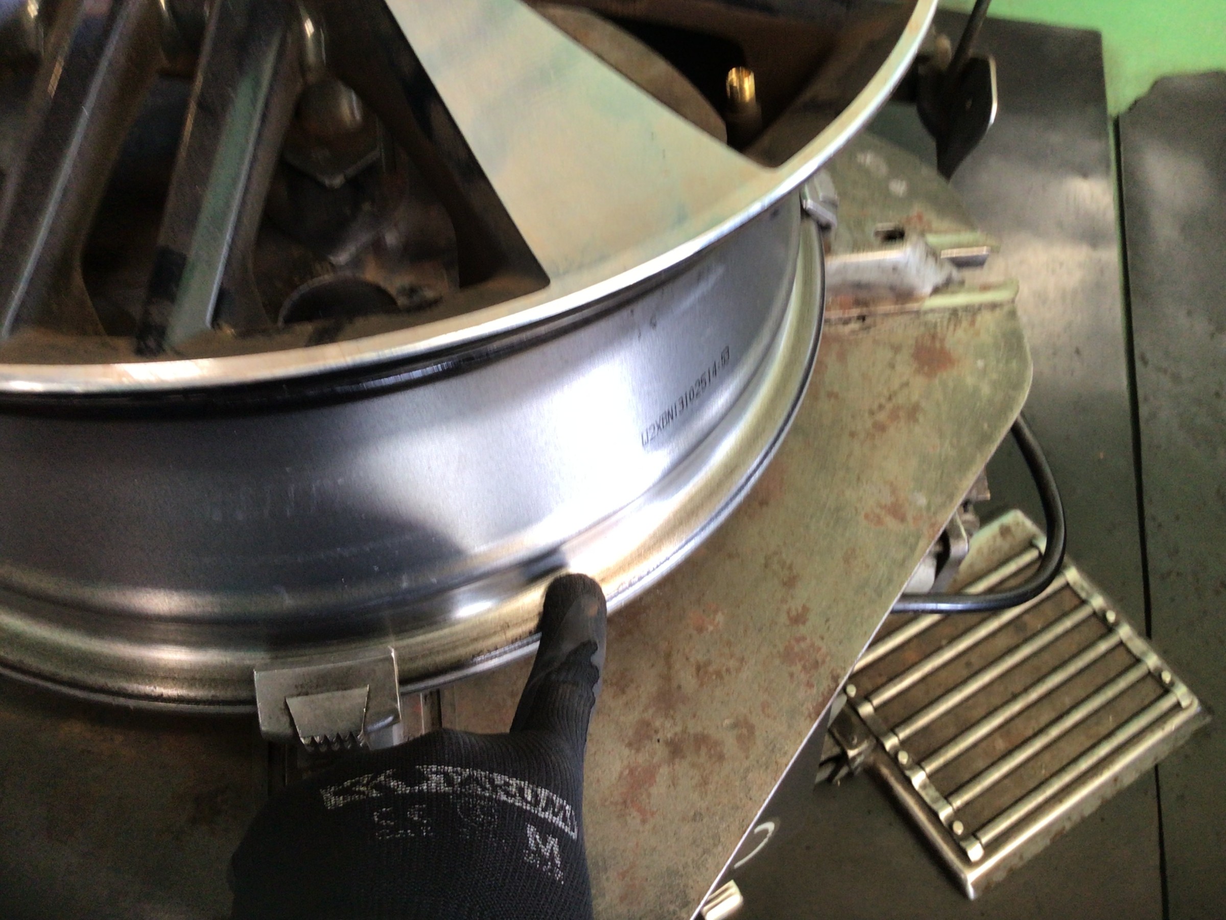 外したホイールのリム部に付着したカスを清掃します。