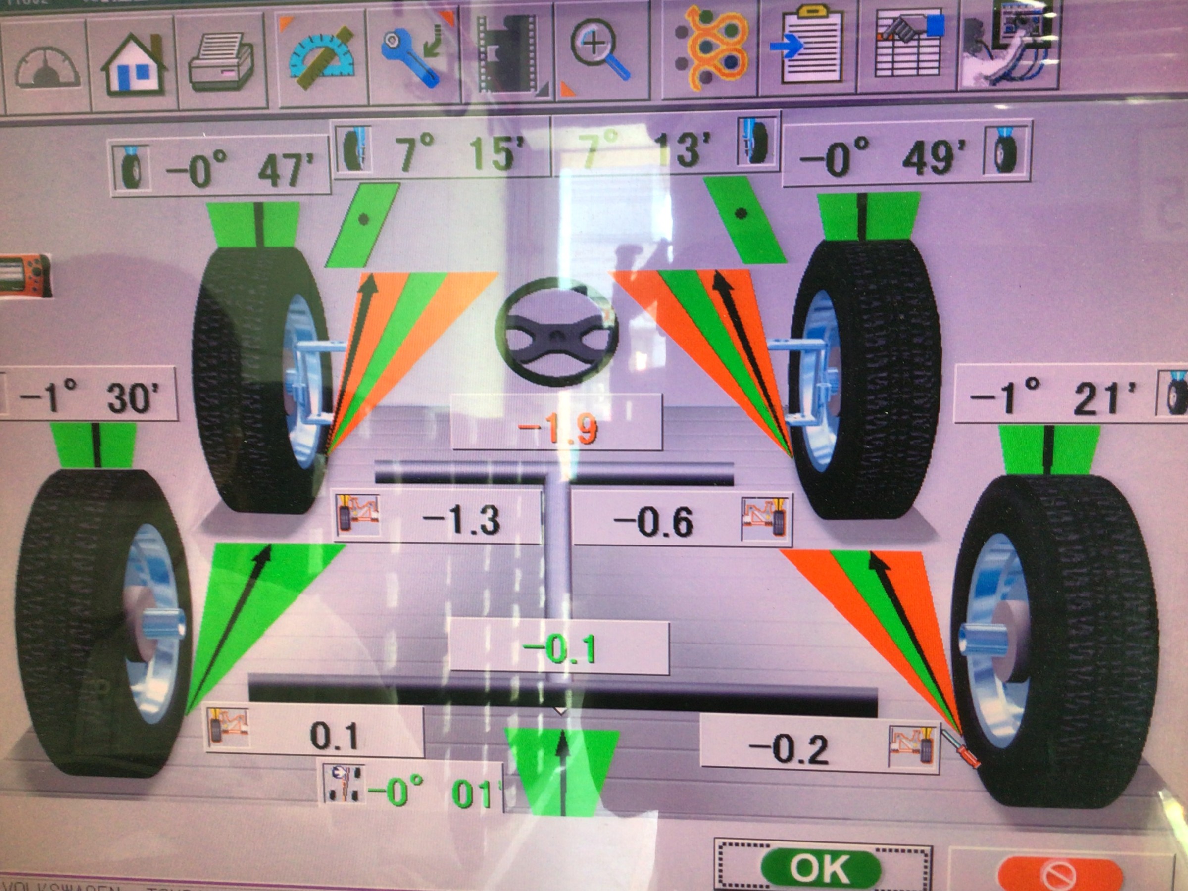 画面奥側が前輪の数値ですが、レッドゾーンになっている部分がトー角度です。