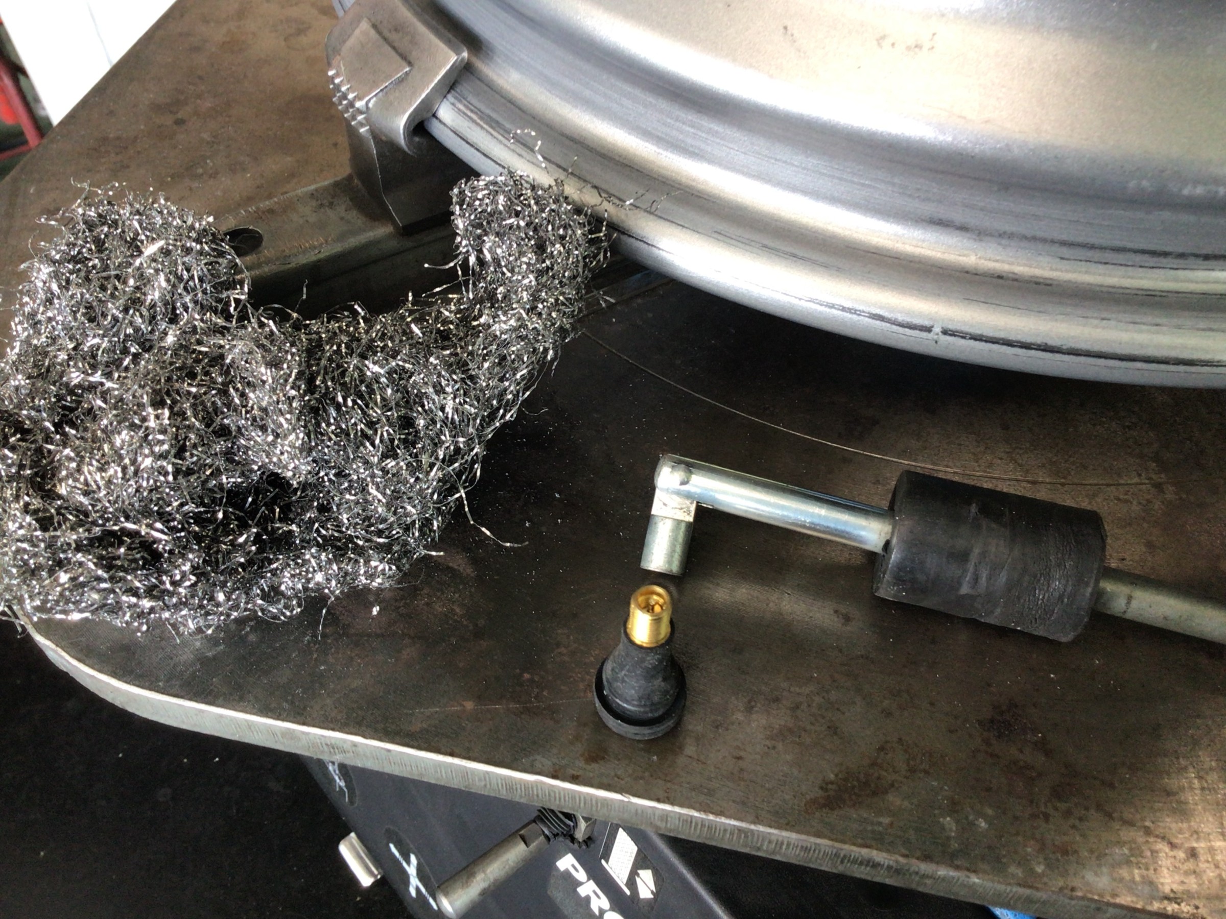 外したホイールのリム部に付着したカスを清掃します。