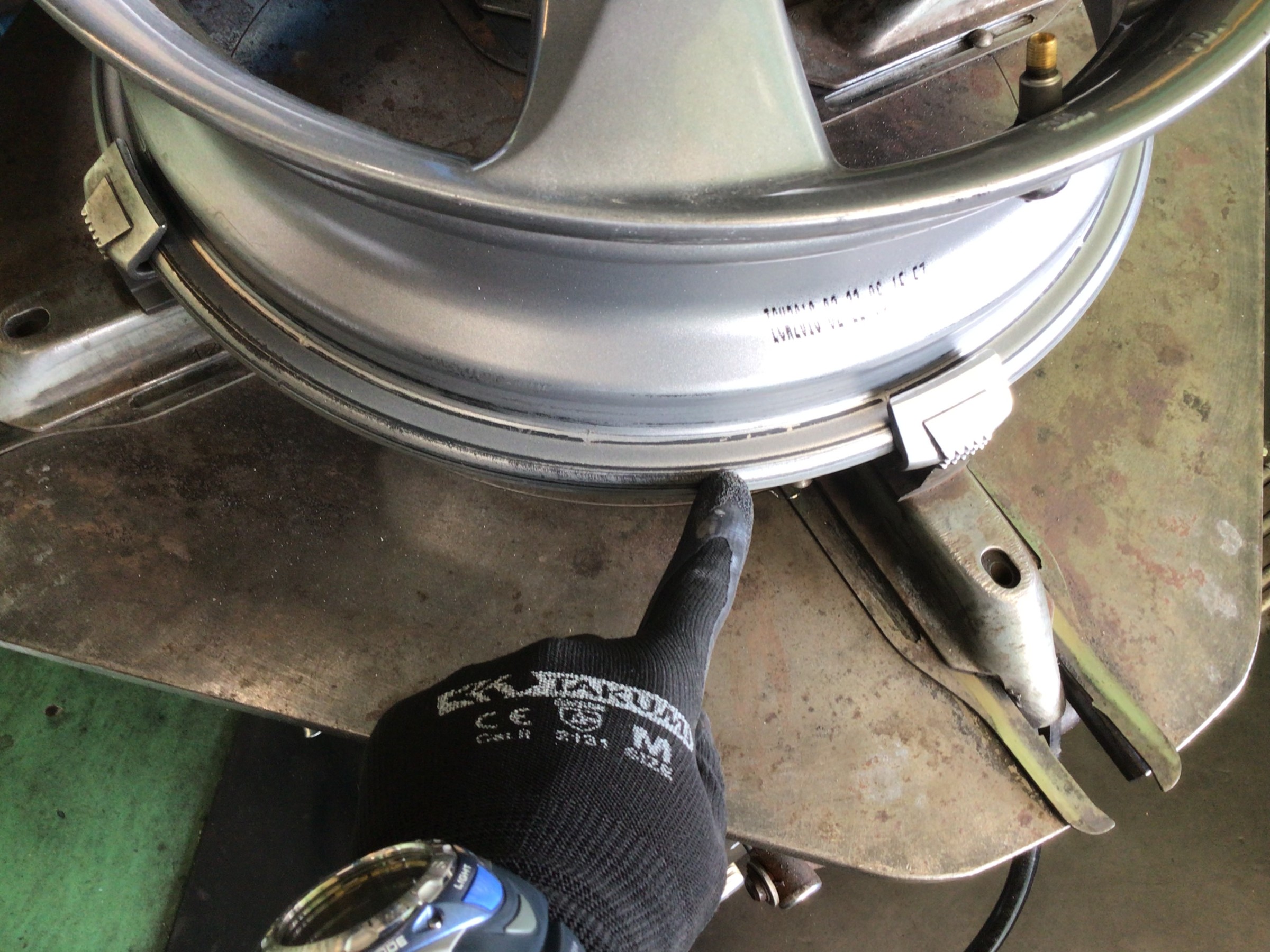 このカスが付着したままタイヤを組み付けますとエア漏れの原因となりますので、
