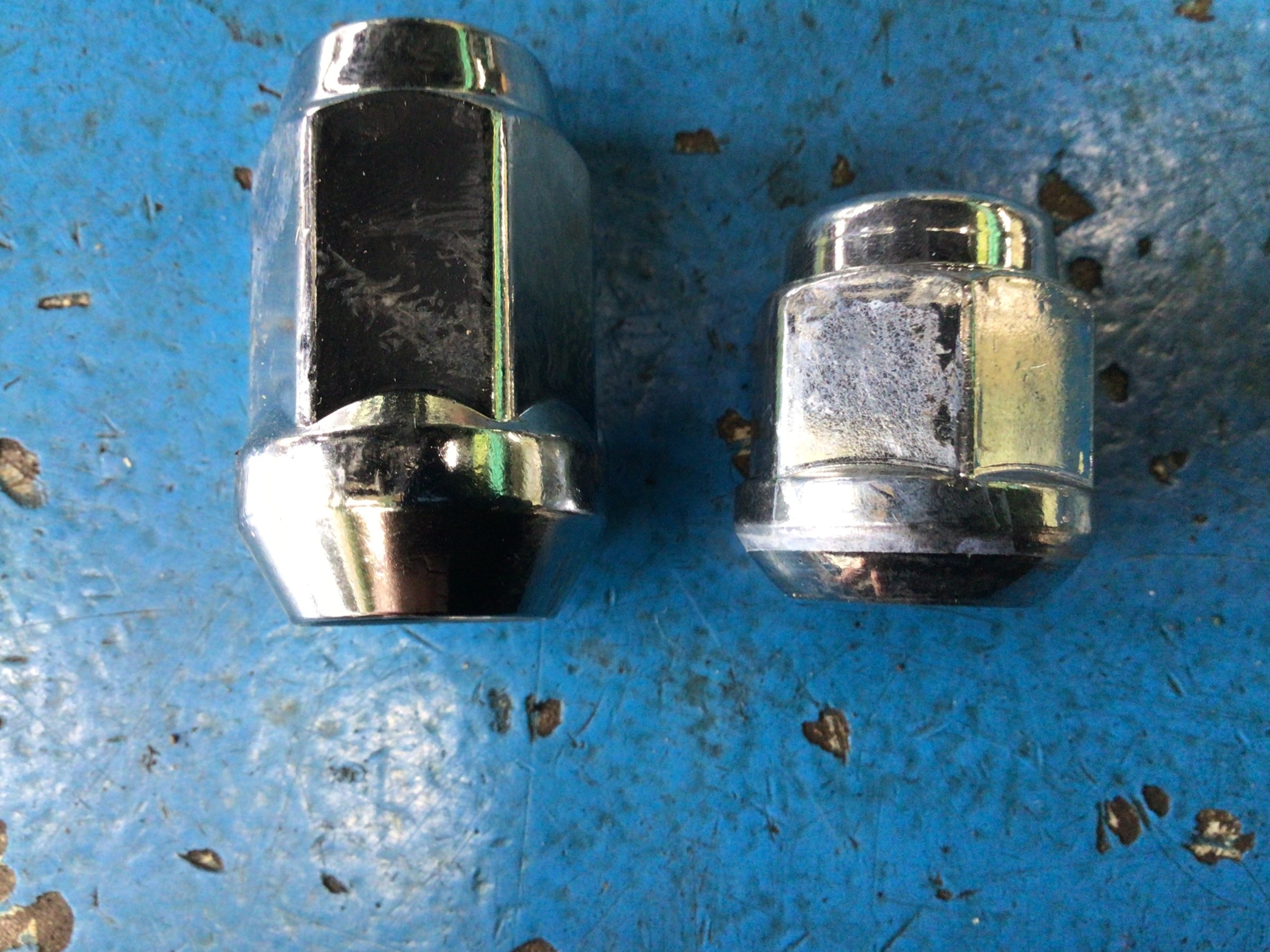 写真左側が一般的な60度テーパーナットで、左側がホンダ純正ホイール専用の球面座ナットです。