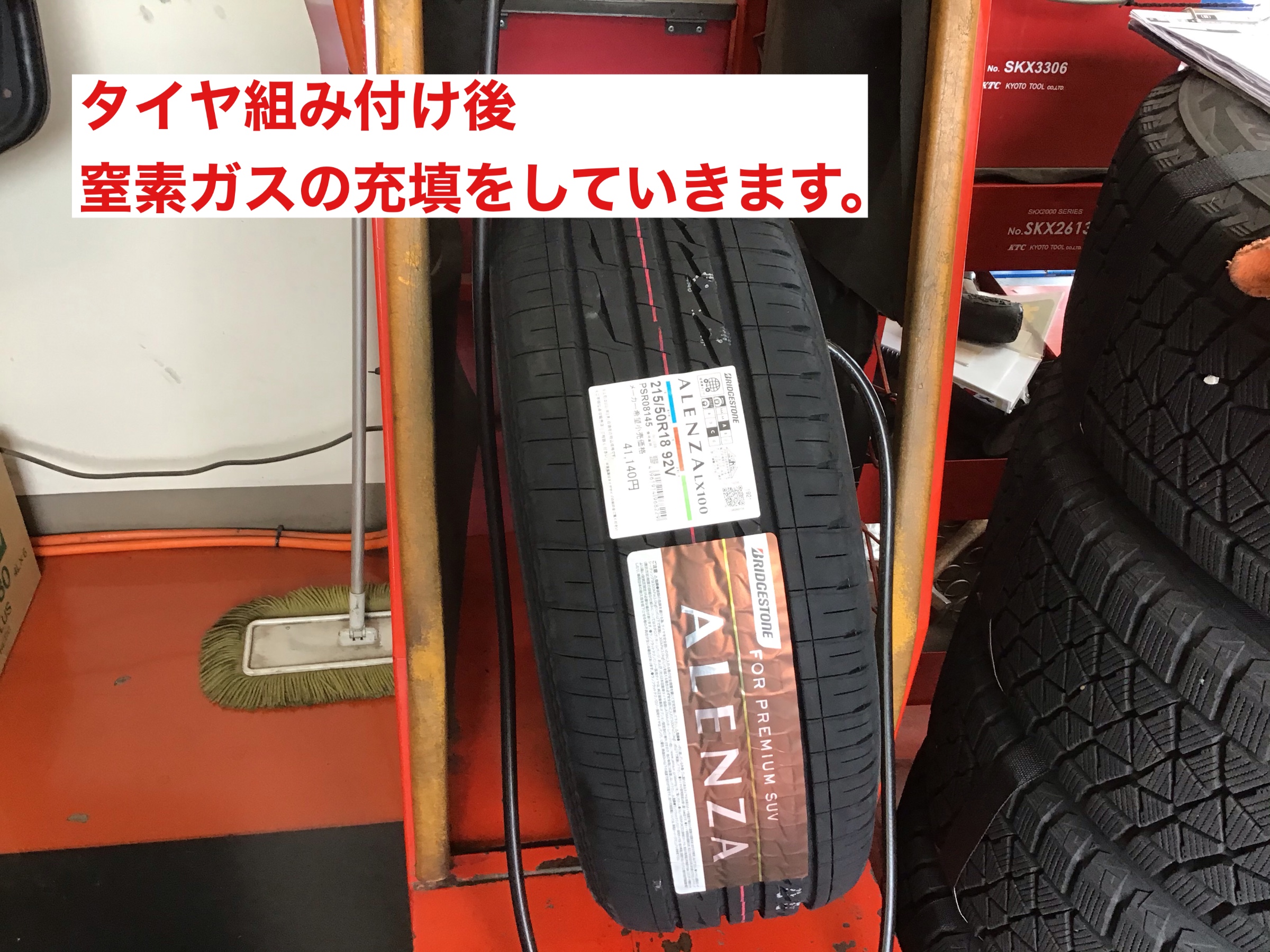 タイヤ組み付け後、窒素ガス(チッソガス)を充填していきます。