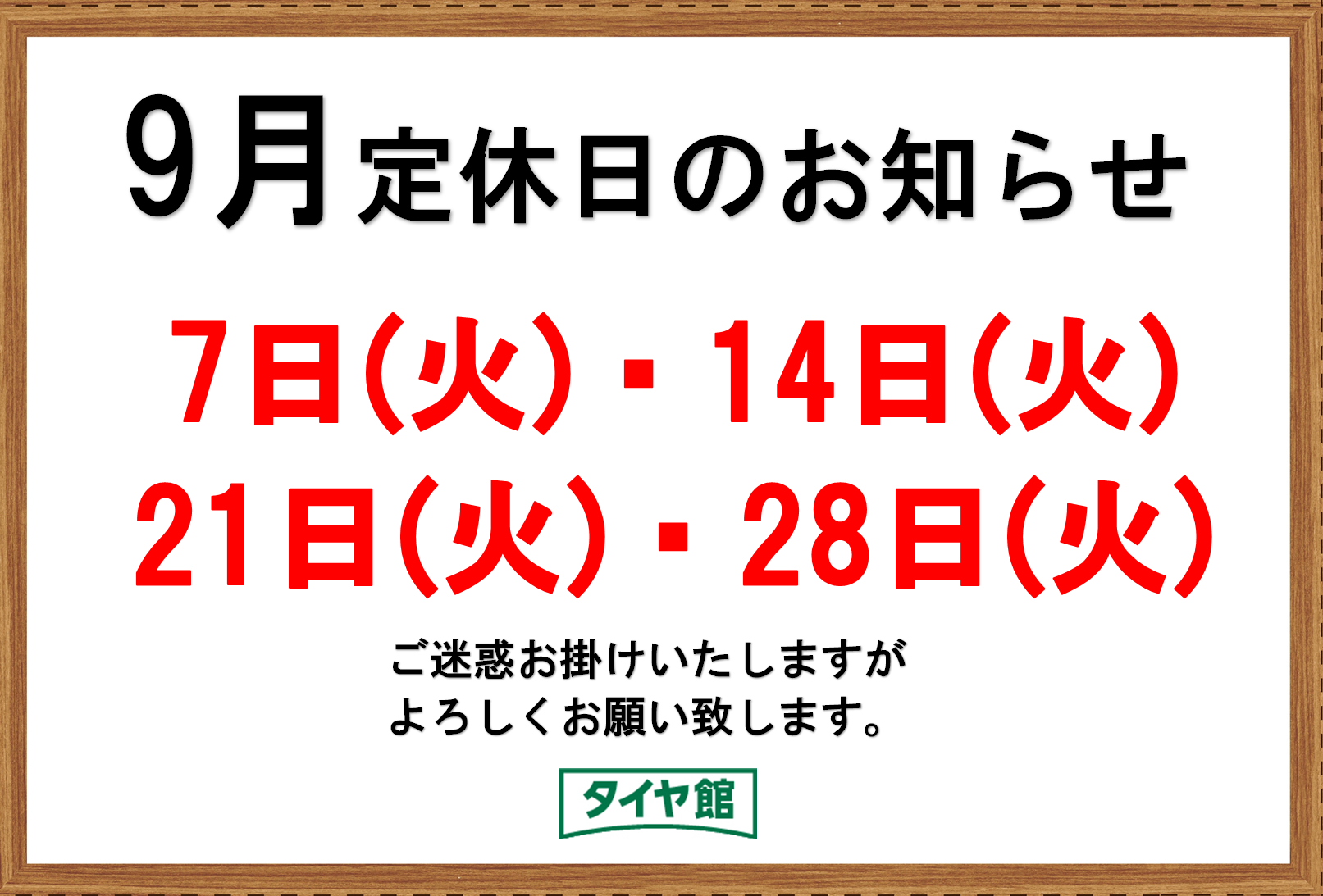 2021年9月定休日のお知らせ ポスト 2021年8月30日 2021年9月の定休日は下記の通りとなります。 7日(火) 14日(火) 21日(火) 28日(火) ご迷惑をお掛けいたしますが よろしくお願い致します。 カテゴリ:お知らせ