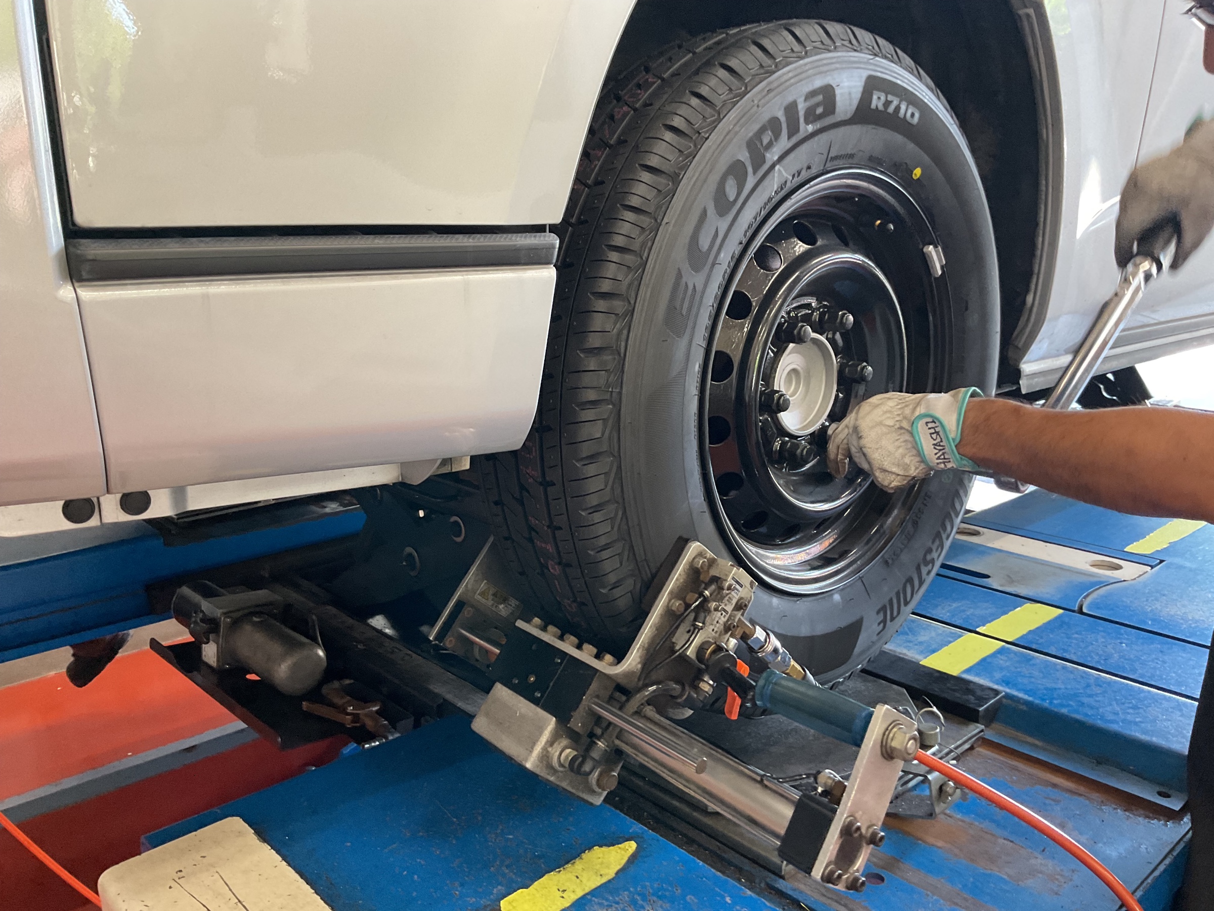 センターフィットの特殊な機械をタイヤにつけてトルクレンチにて規定値で締め付けていきます