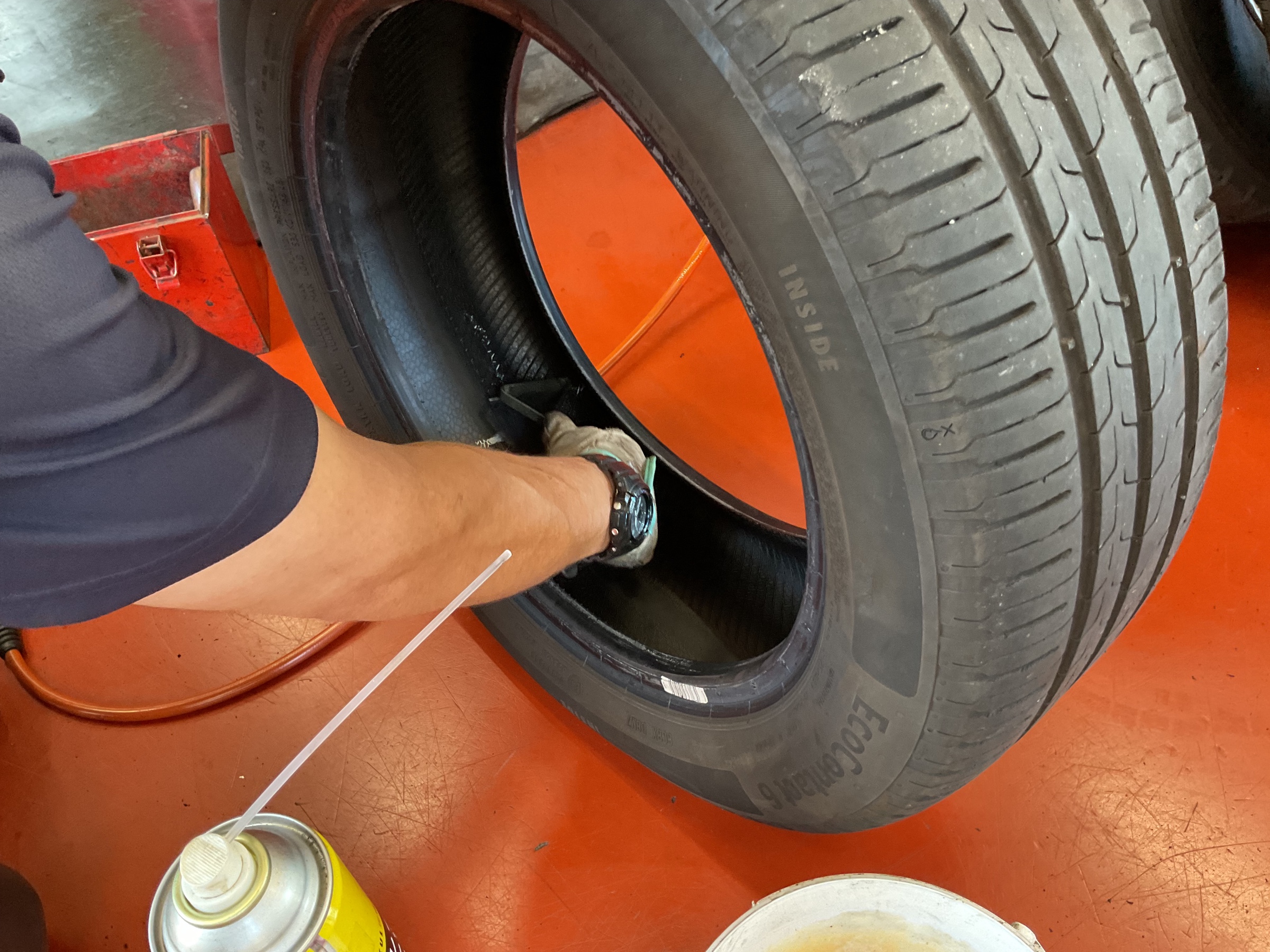 空気を充填し修理後からのエアー漏れがないかなどの確認をします