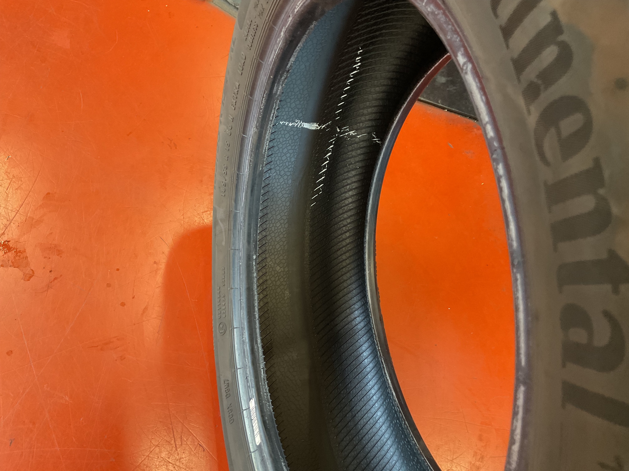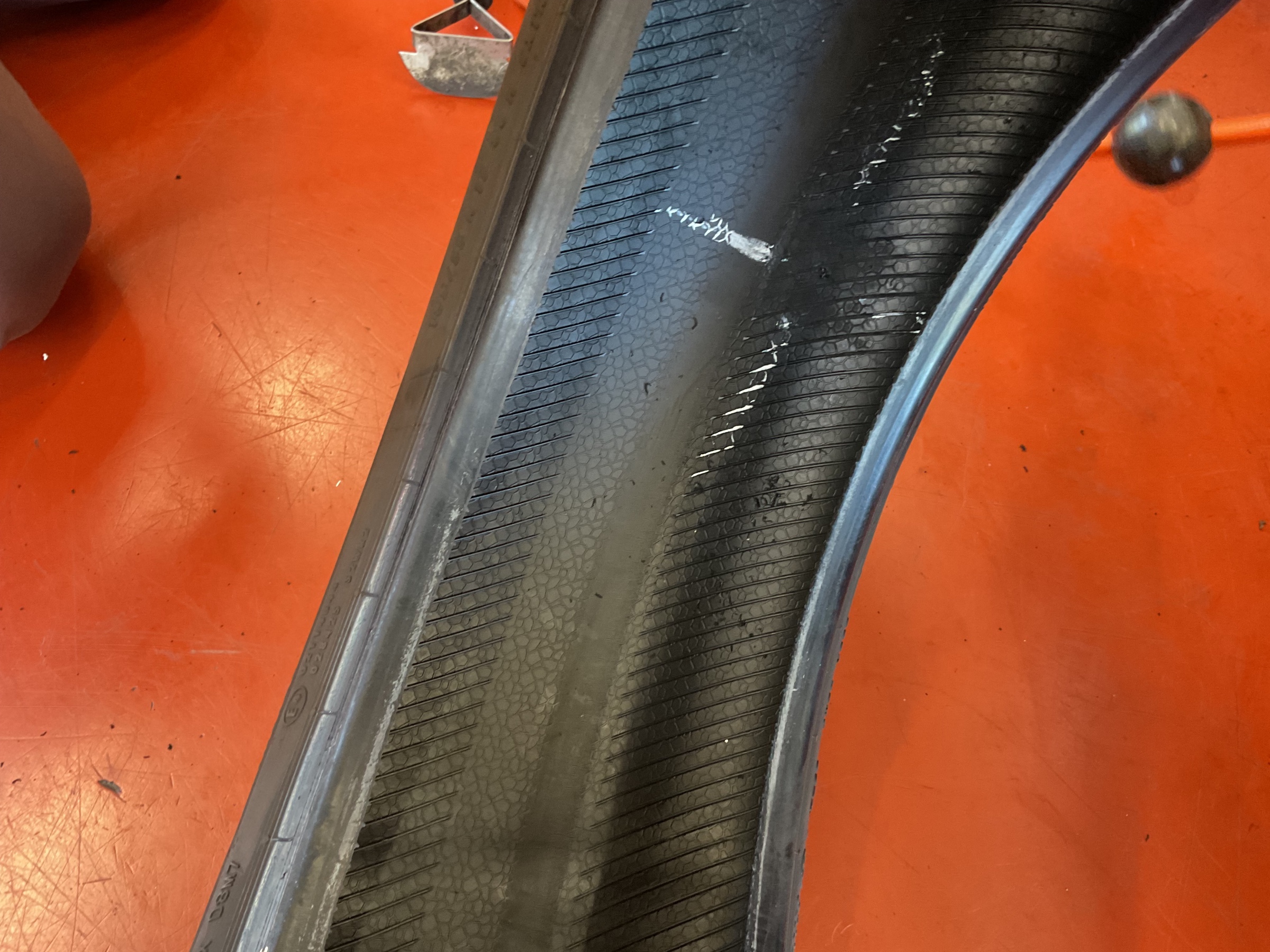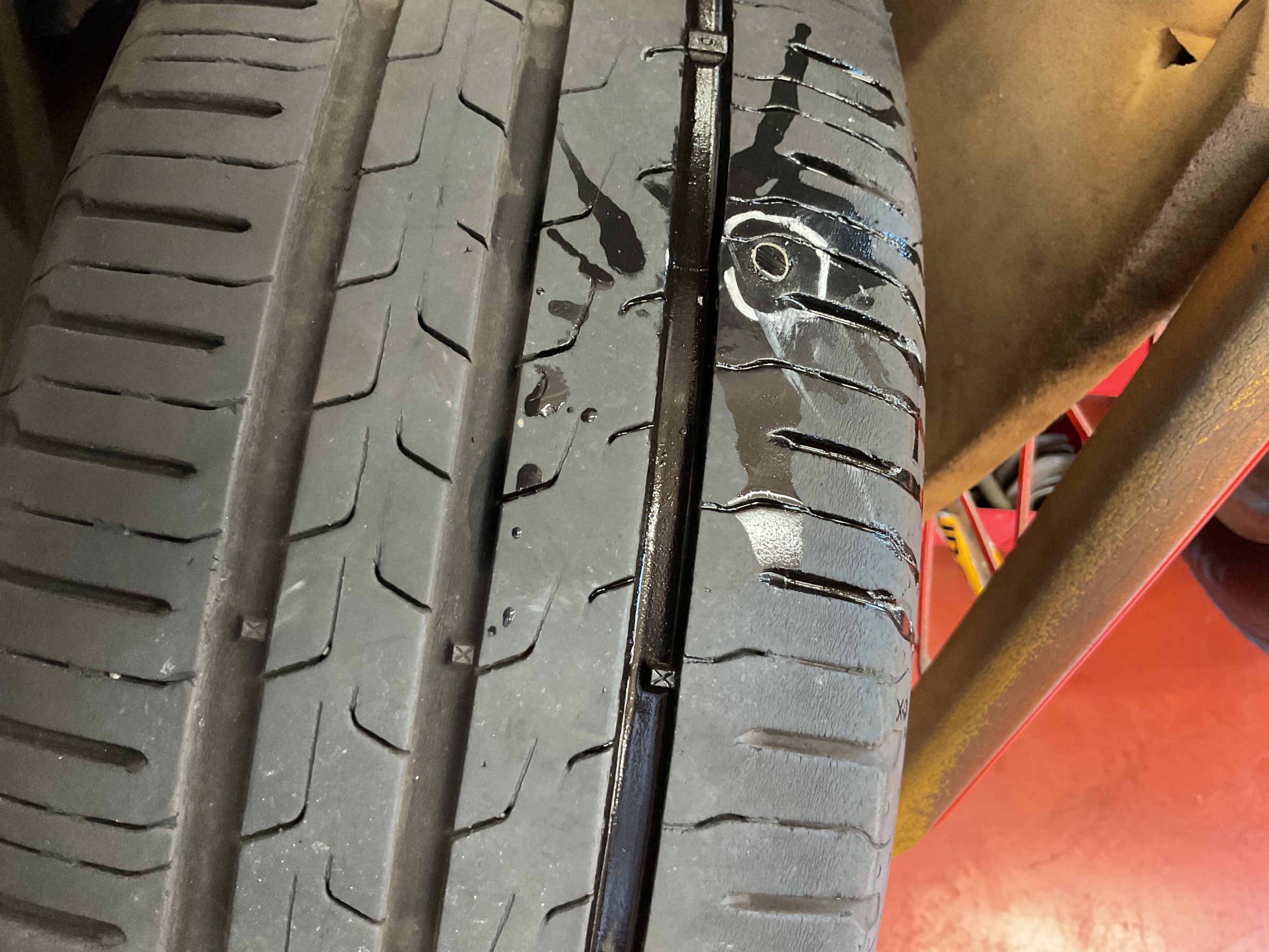 タイヤの中に損傷やしわが出来ていないか、刺さっているものなどの確認をします