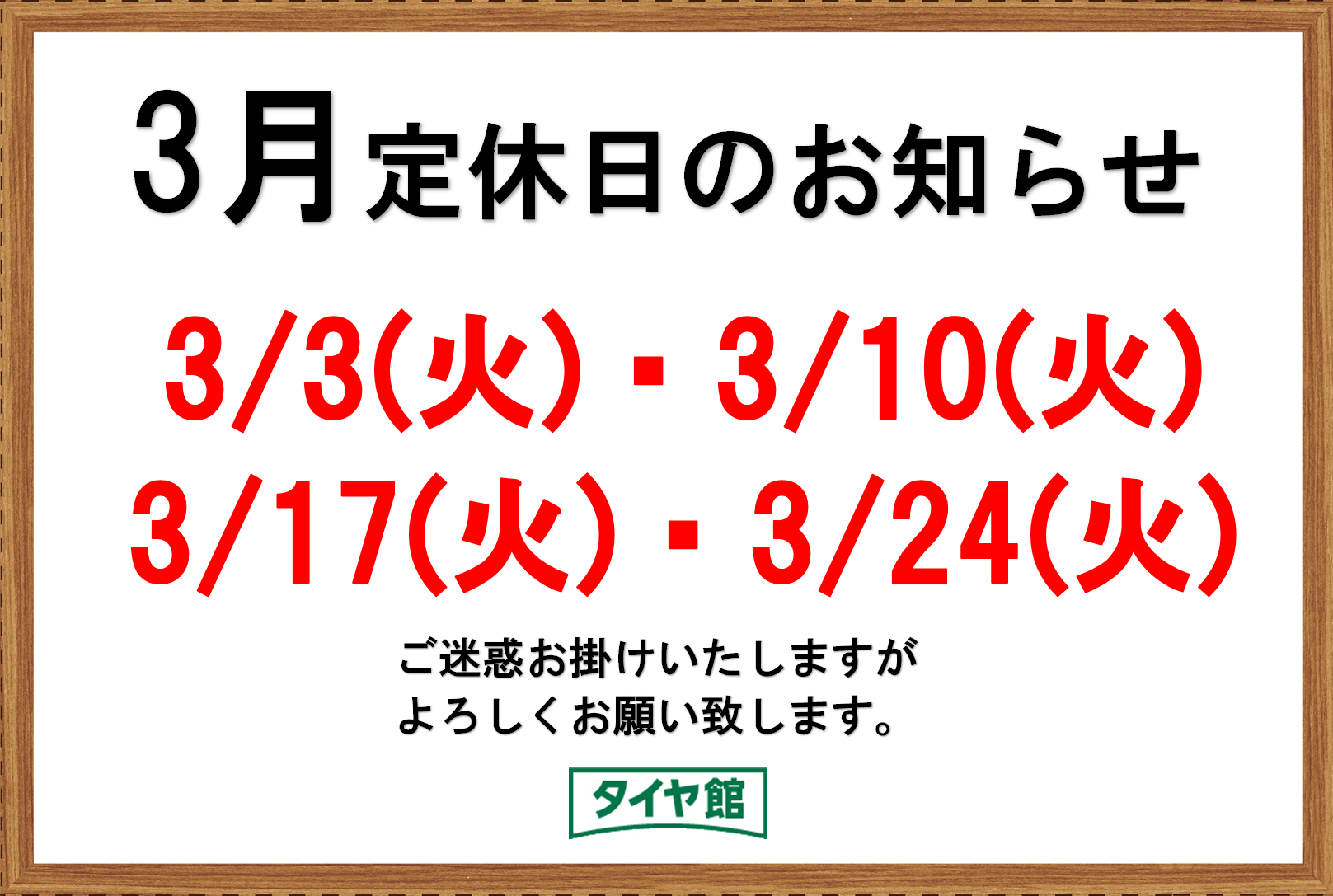 本日定休日です ポスト 2020年3月17日 いつもタイヤ館葉山店をご利用頂き誠にありがとうございます。 本日定休日となっております。 ご迷惑お掛け致しますが宜しくお願い致しますm(_ _)m 担当:秋元