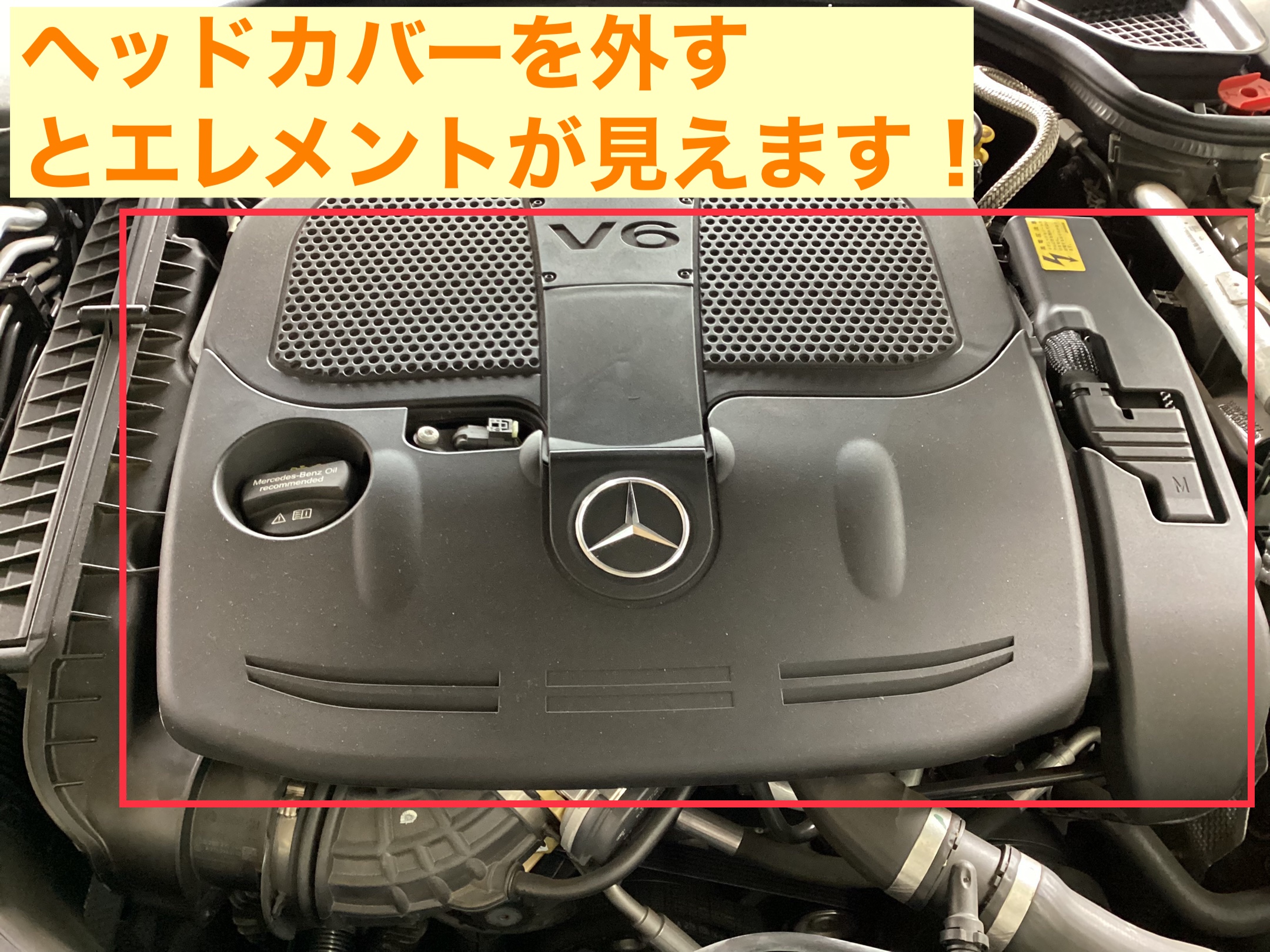 今回はエンジンオイルとオイルエレメントの交換をさせて頂くので、エンジンのカバー(赤で囲まれている美部分)を外します。