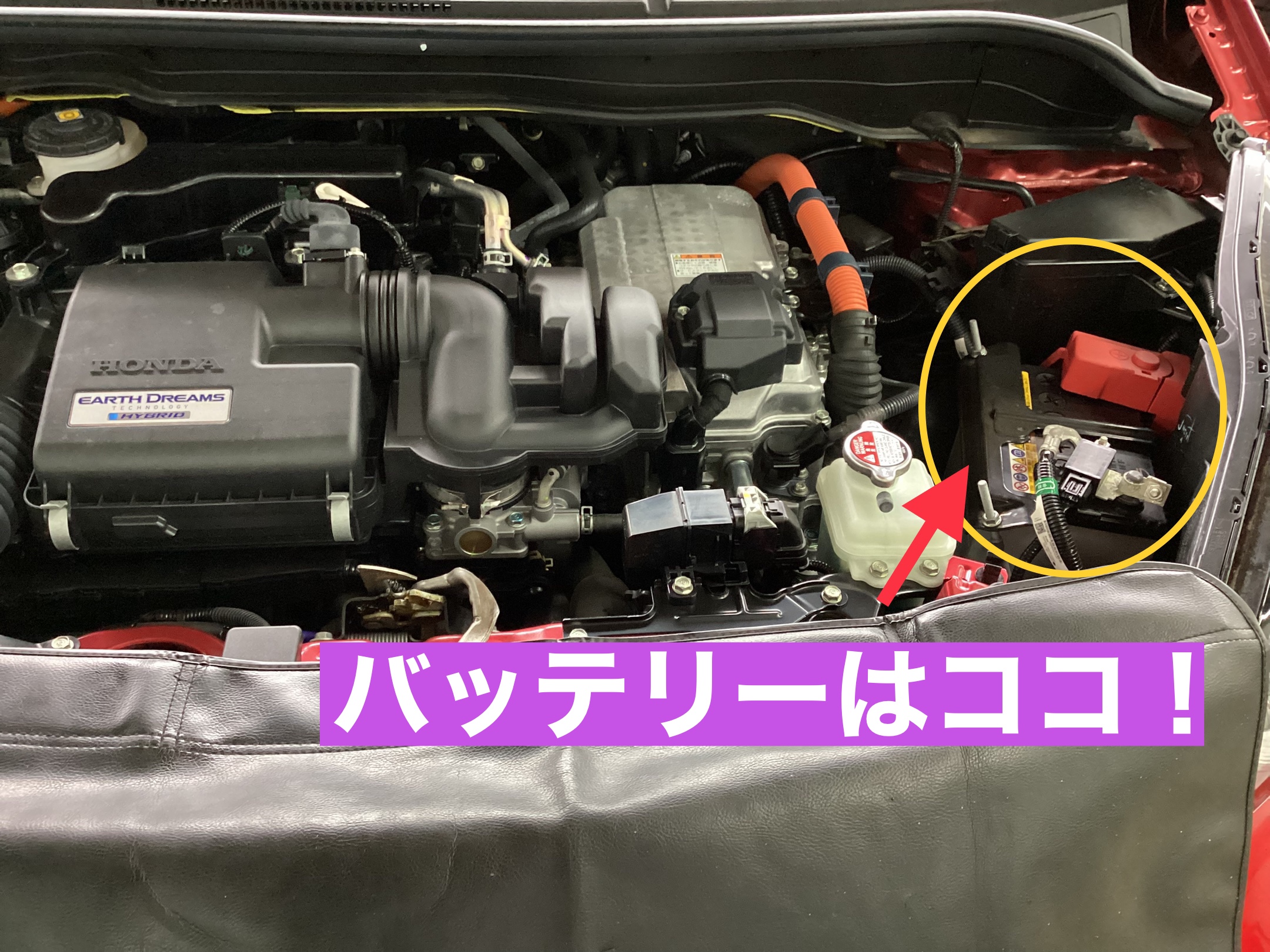 バッテリーはボンネットを開けた右端にあります!!
