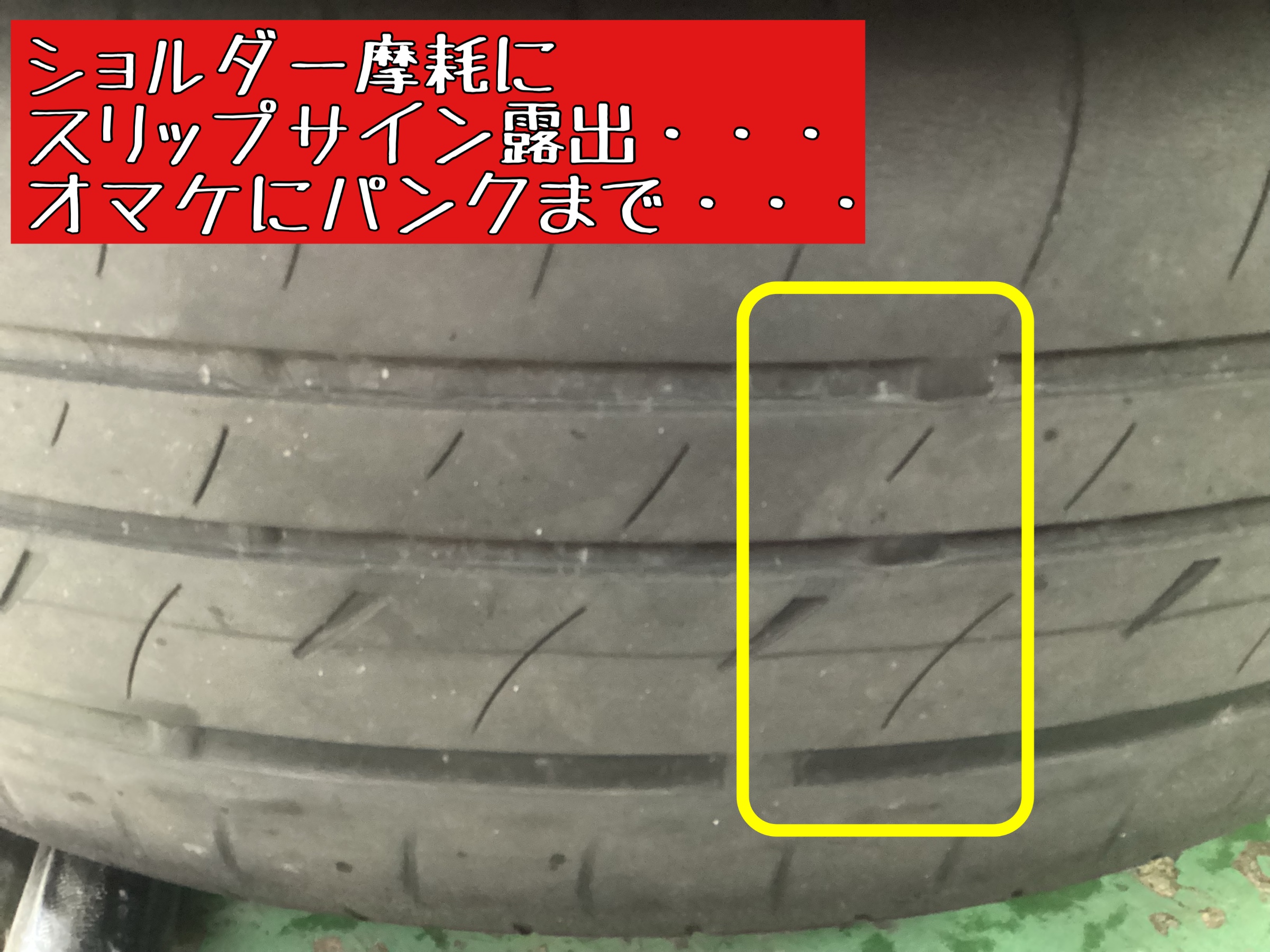 タイヤは摩耗が進んでいて車検不適合(スリップサインが露出)の所まで摩耗が進んでしまっているのと、釘が刺さりパンクしてしまってました・・・(;'∀')