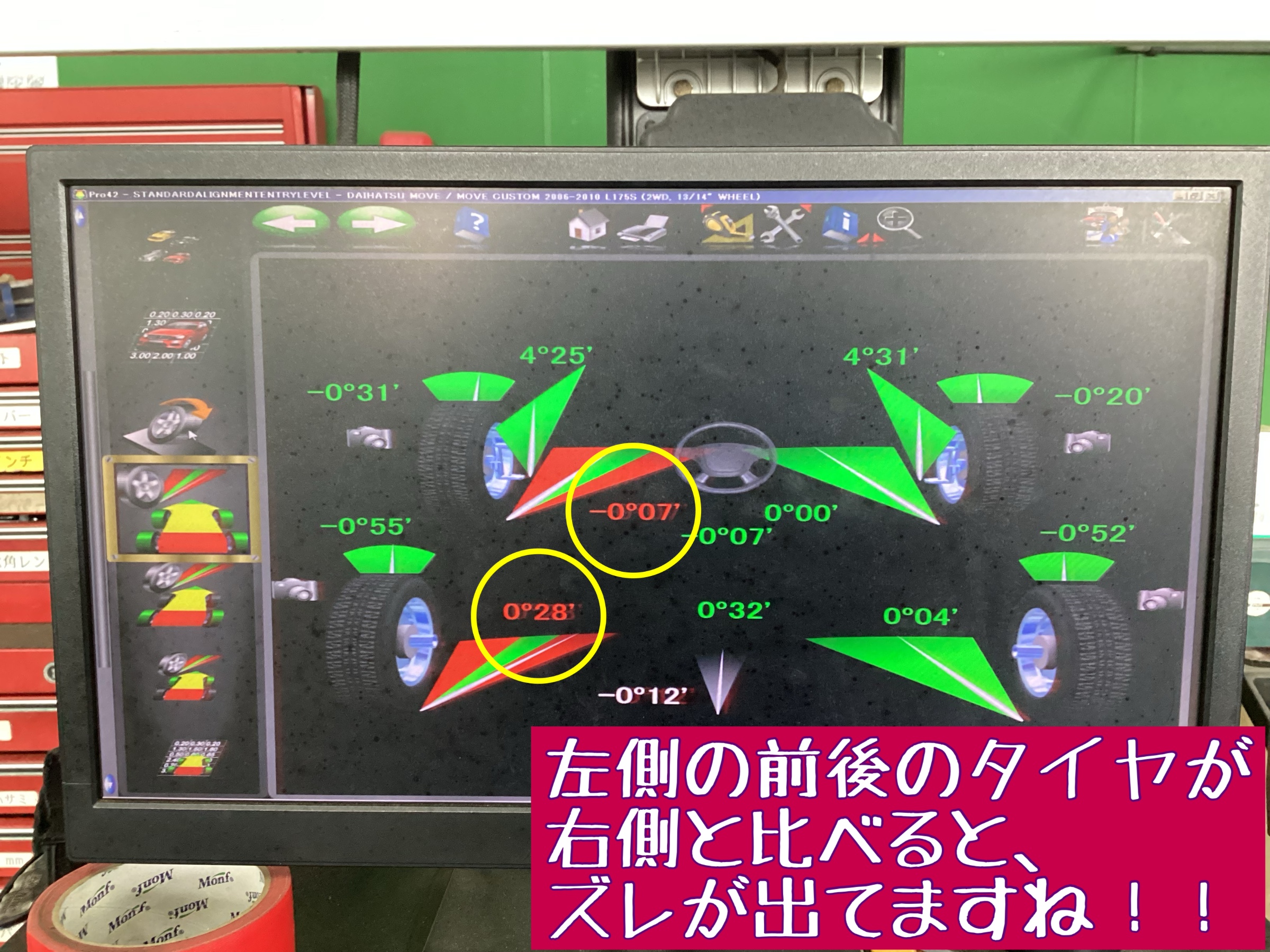 赤い数字の所がメーカー推奨値からズレてますよって案内になるのですが、「ムーブ」の場合は前タイヤのトー(内股・がに股)の調整しか出来ないので、左前タイヤのつま先(がに股気味)の向きを正しい向きに調整させて頂いてから、オーナー様へ納車させて頂きました(`・ω・´)ゞ