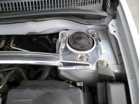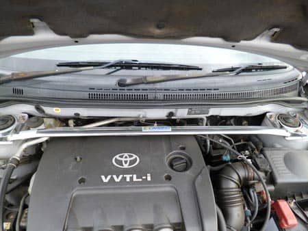 『ストラットバーは、サスペンションのアッパー取付部の左右を結び、コーナーリング時に発生するボディのねじれを抑えハンドリングやスタビリティーを向上させ、サスペンションの性能をフルに引き出すボディ補強の基本パーツです。』