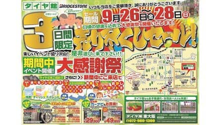 タイヤ館東大阪店では、9/26(金)から9/28(日)まで、