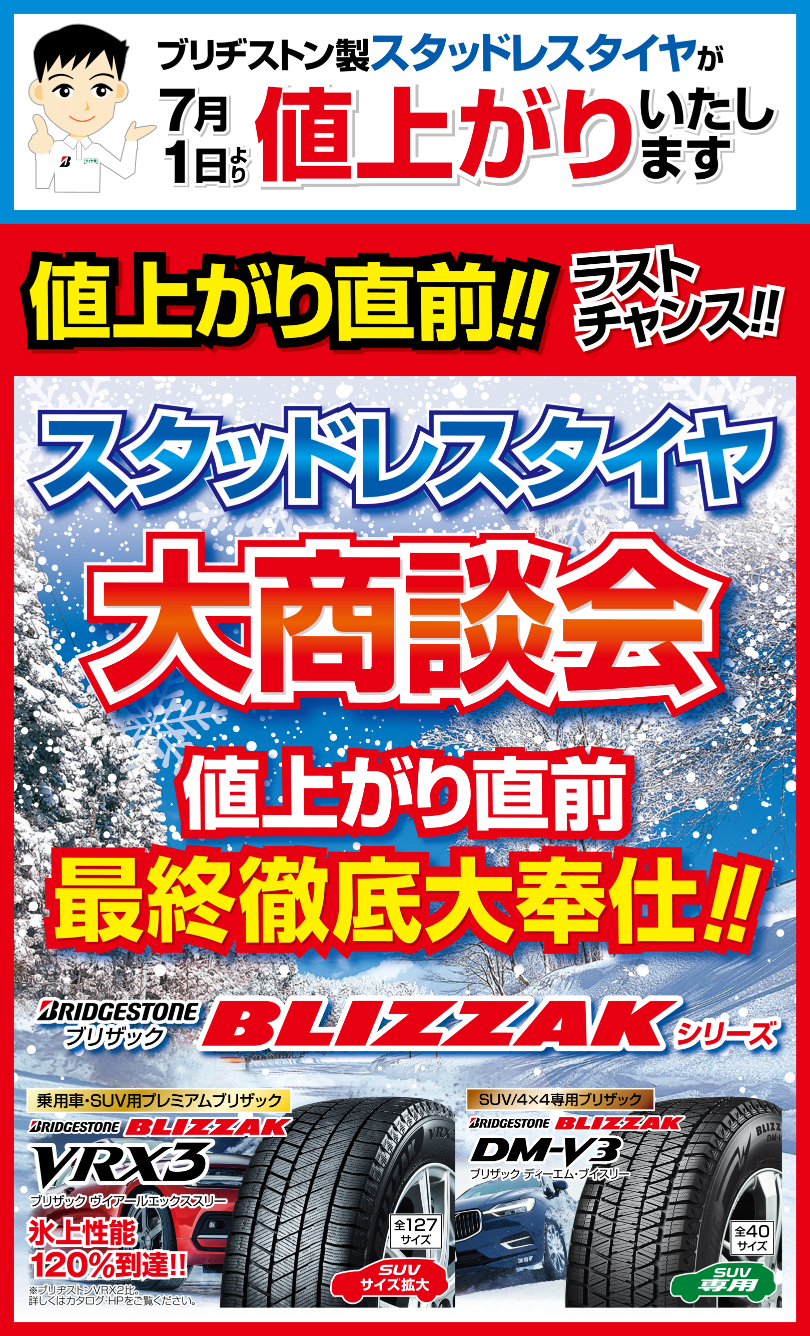 【リフレッシュキャンペーン】、開催中です!愛車をお得にメンテナンスするチャンス♪ ポスト 2023年6月2日 いつもタイヤ館 東大阪店をご利用いただき、ありがとうございます!! 当店ではお車のメンテナンスがお得にできる、【リフレッシュシャンペーン】を開催しています♪ タイヤ交換やオイル交換と一緒にご購入いただくことでいつもよりお得にメンテナンス商品を購入していただけるチャンスです! 上記チラシの通り、かなりお得なキャンペーンとなっております!是非ご利用ください(^^)/ 続けてのお知らせにはなりますが、【2023年 7月】より、スタッドレスタイヤが値上がりします・・・;; 値上がり前の今、お得にご購入していただき、年末付近に取り付けることも可能です◎ 詳しくは当店スタッフまでお問合せください! TEL→072-980-1300 おまちしております('◇')ゞ タイヤ館 東大阪 住所:579-8005大阪府東大阪市元町2丁目2-50 電話番号: 072-980-1300 相談予約 タイヤ点検・安全点検/タイヤ履き替え/オイル交換/その他ピット作業の予約