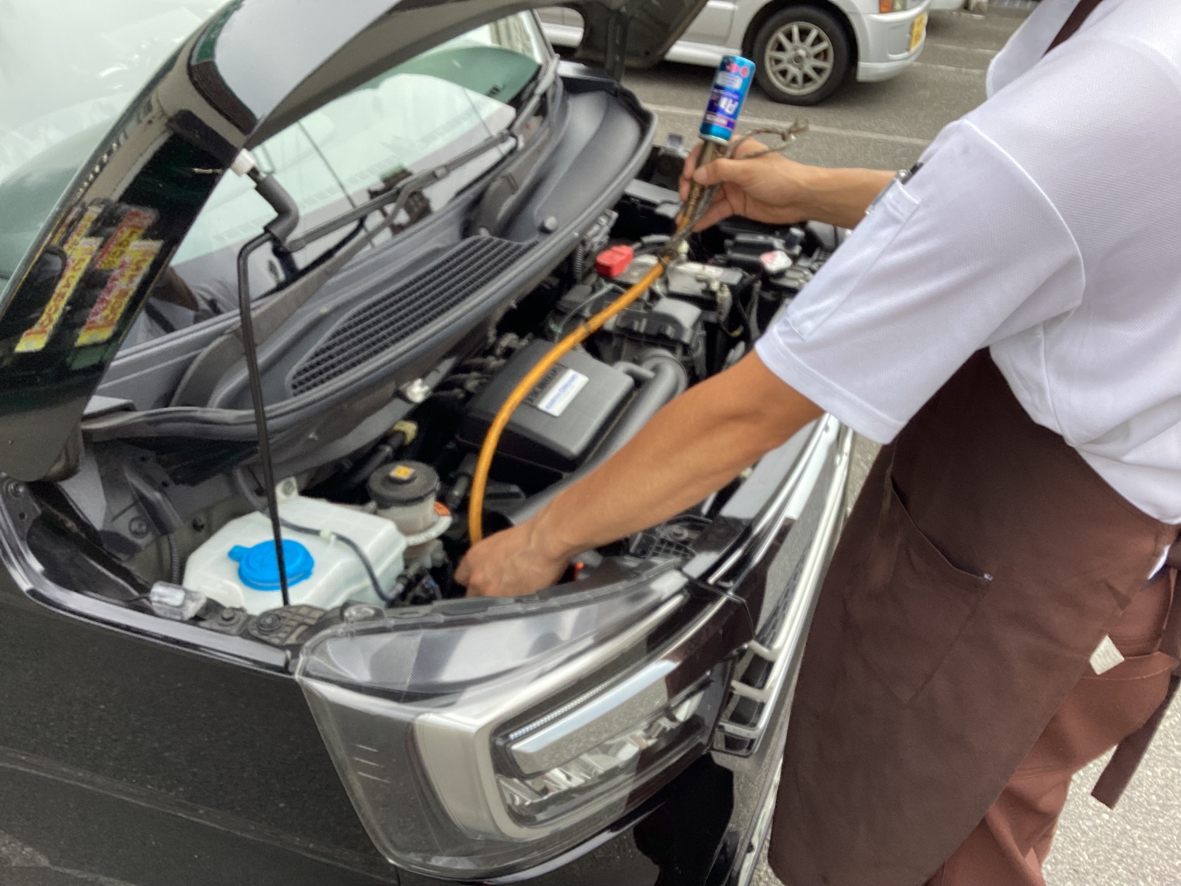 ほとんどのお車はこのようにボンネット内のエアコンの低圧配管から注入します♪